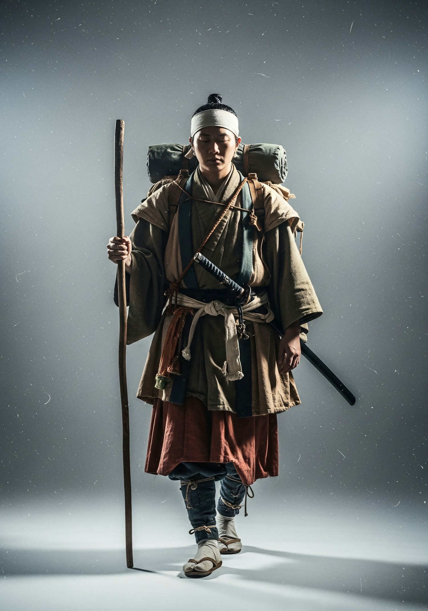 A person in traditional attire with a staff and sword, standing confidently against a neutral background, showcasing cultural and historical elements.