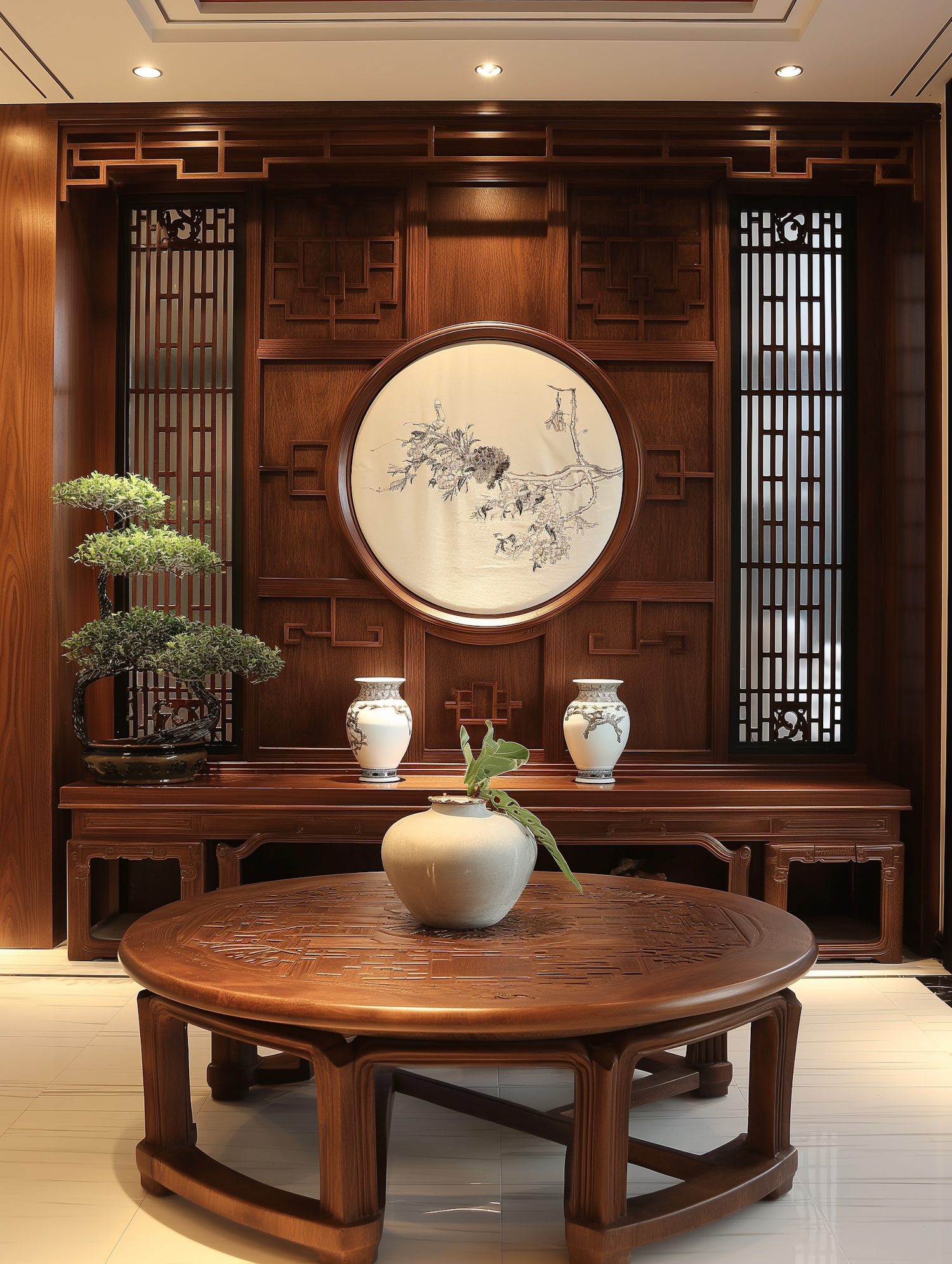 Elegant Asian-inspired interior with carved wooden table, bonsai, and ceramic vases, creating a serene and harmonious atmosphere.