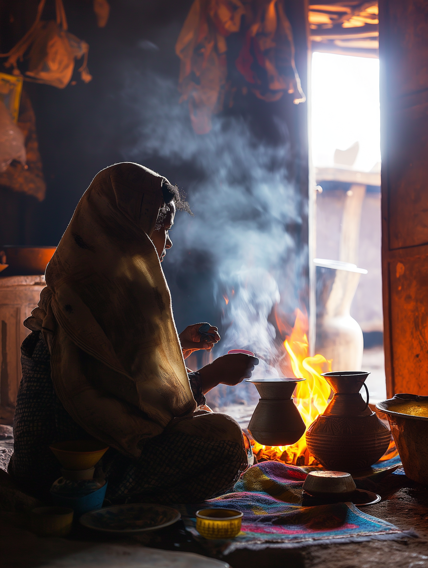 A woman in a dim room tends to a fire with clay pots, creating a warm glow. Smoke rises, contrasting with bright daylight from an open door.