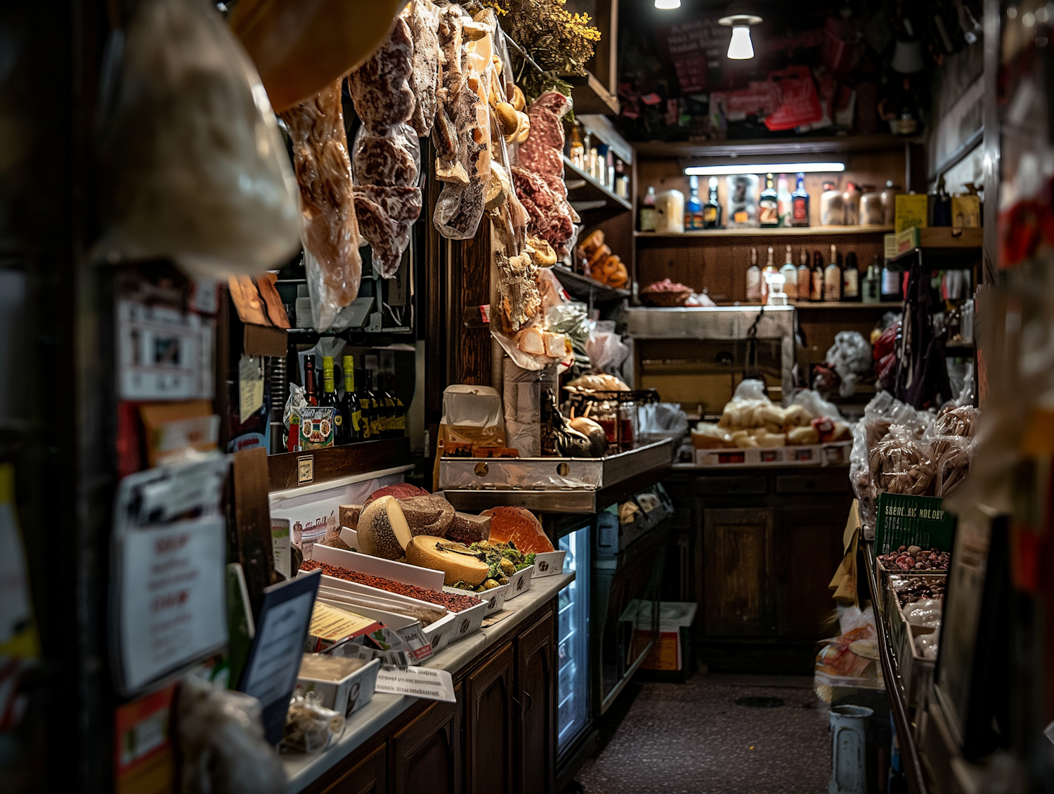 Cozy deli shop with hanging cured meats, cheeses, and wine bottles. Warm lighting highlights the rustic charm and gourmet offerings.