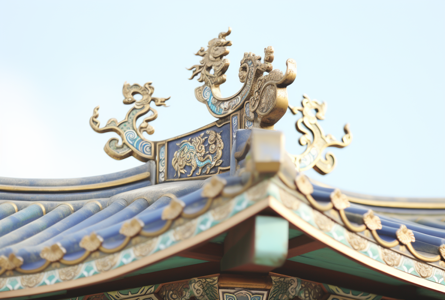 Close-up of an ornate Asian roof with intricate dragon designs and vibrant blue and gold colors against a clear sky.
