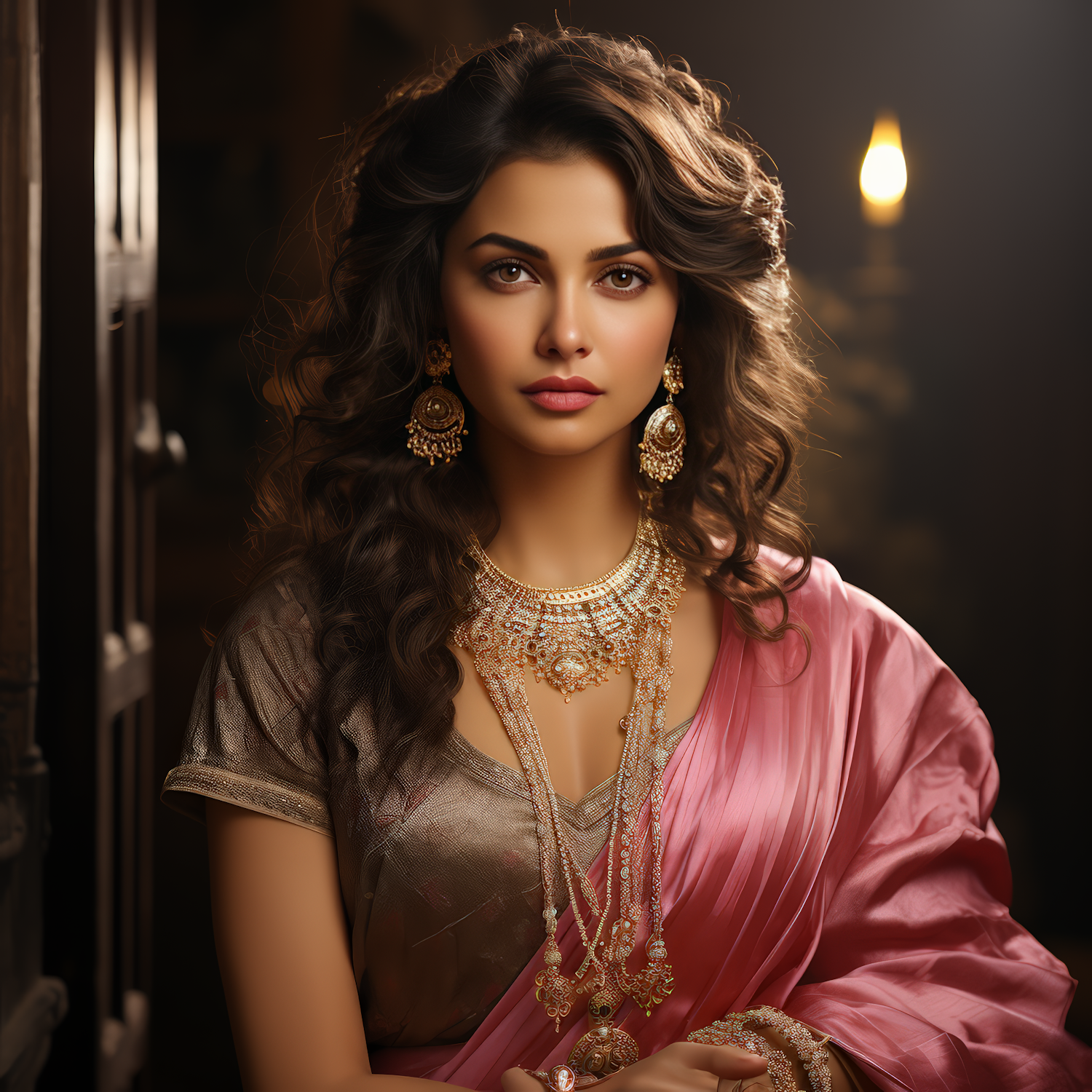 Elegant woman in traditional Indian attire with gold jewelry, featuring a pink sari and intricate necklace, set in a warmly lit background.
