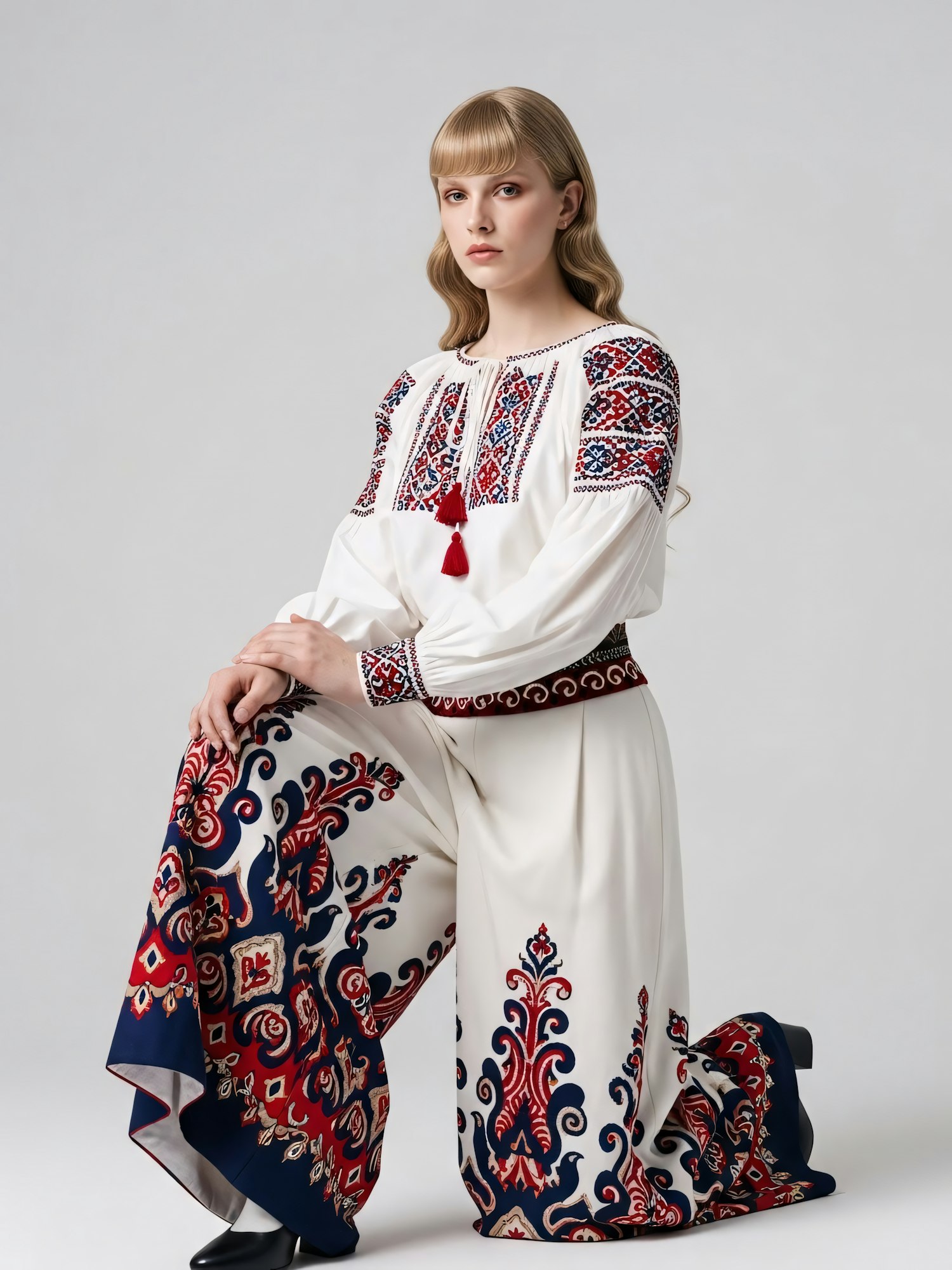 A person in a traditional embroidered outfit with red and blue patterns, showcasing intricate craftsmanship and cultural design.