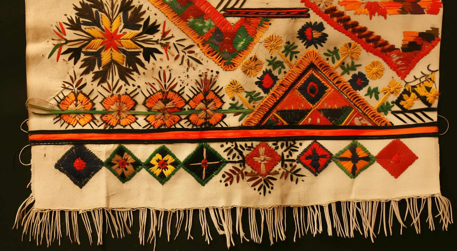 Intricate traditional embroidery with floral and geometric patterns on cream fabric, featuring vibrant colors and white fringed edges.