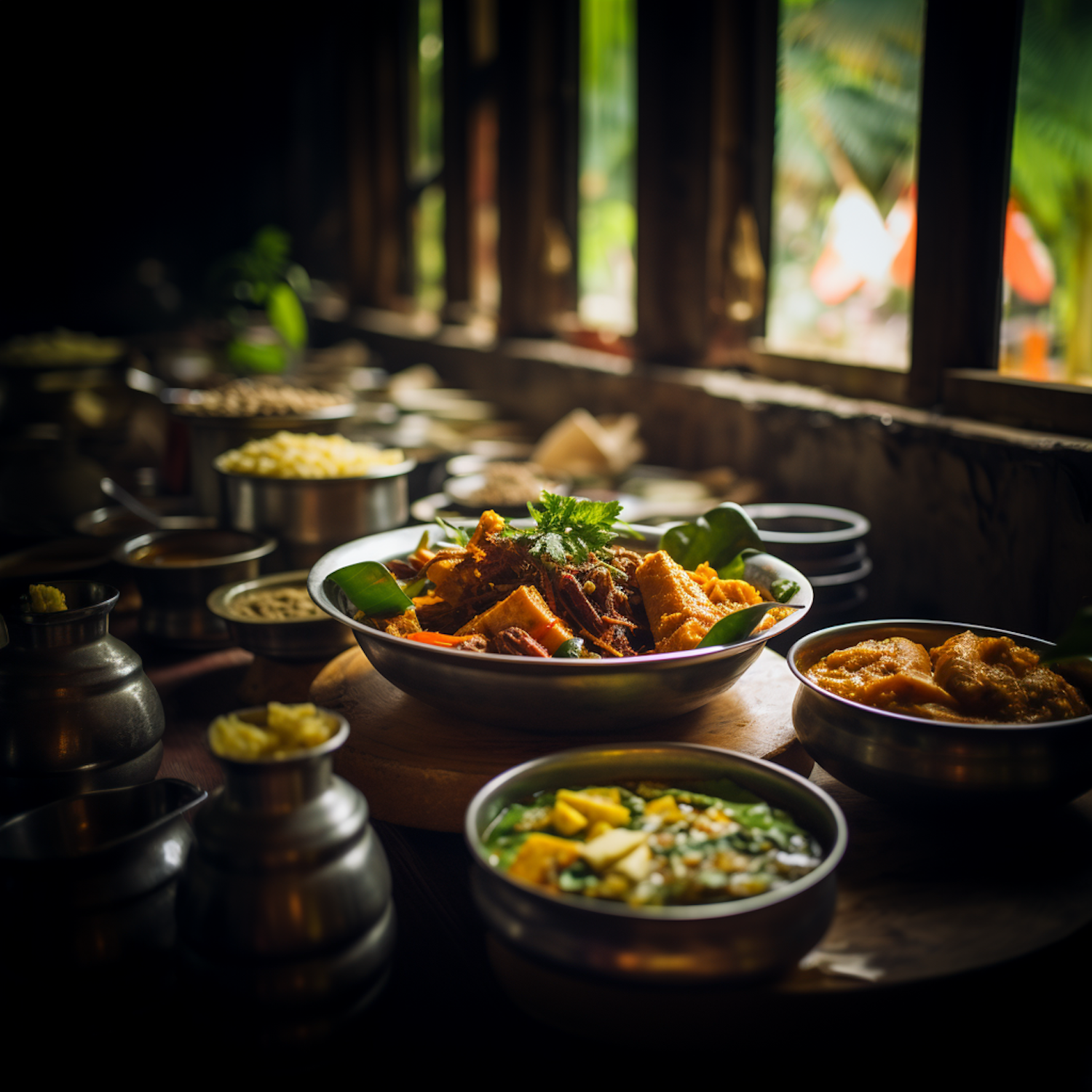 A vibrant spread of traditional Indian dishes in metal bowls, highlighted by warm sunlight through a window.