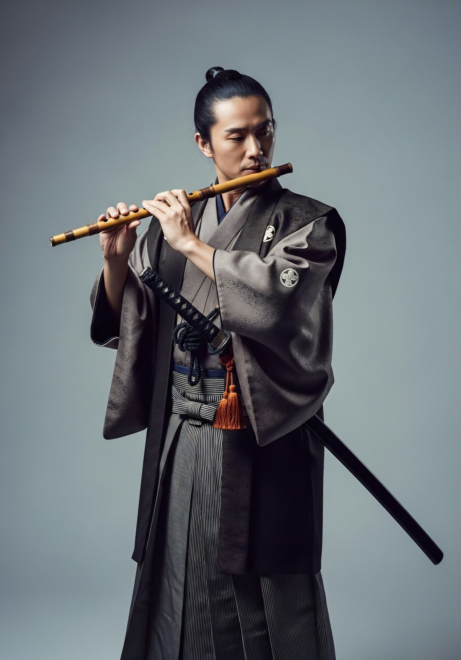 A person in traditional Japanese attire plays a bamboo flute, with a katana at their side, showcasing a blend of culture and artistry.