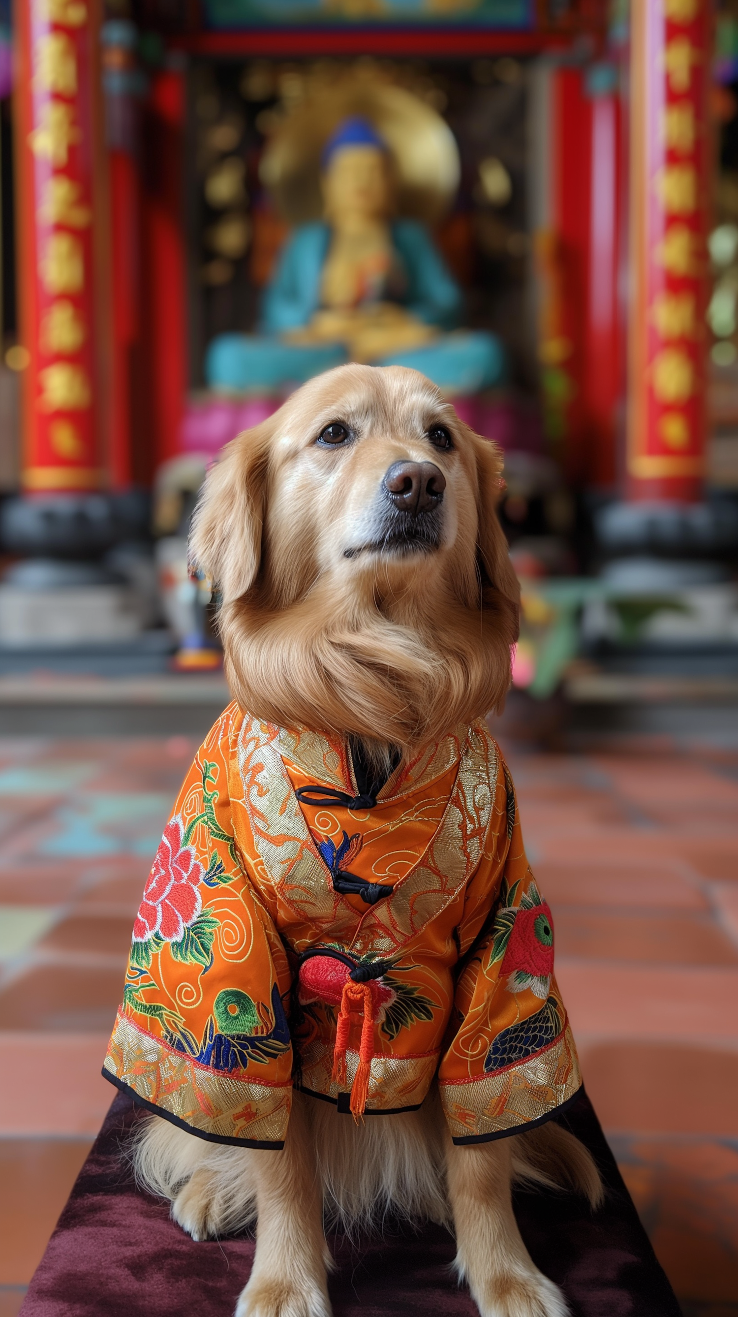 Golden retriever in ornate orange robe sits calmly in a temple setting, with a Buddha statue in the background.