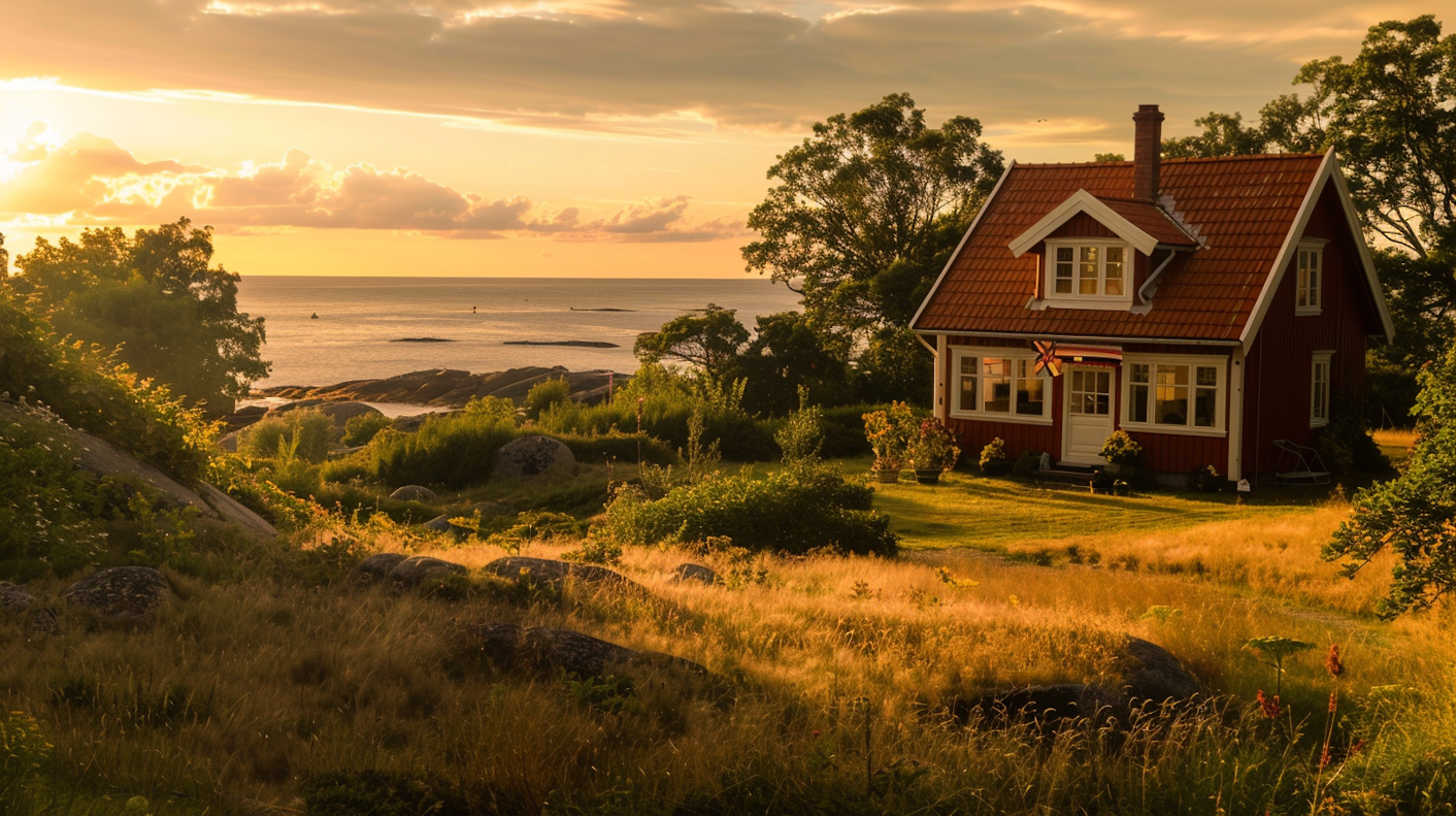 Charming red cottage by the sea at sunset, surrounded by lush greenery and a serene landscape. Perfect for a peaceful retreat.