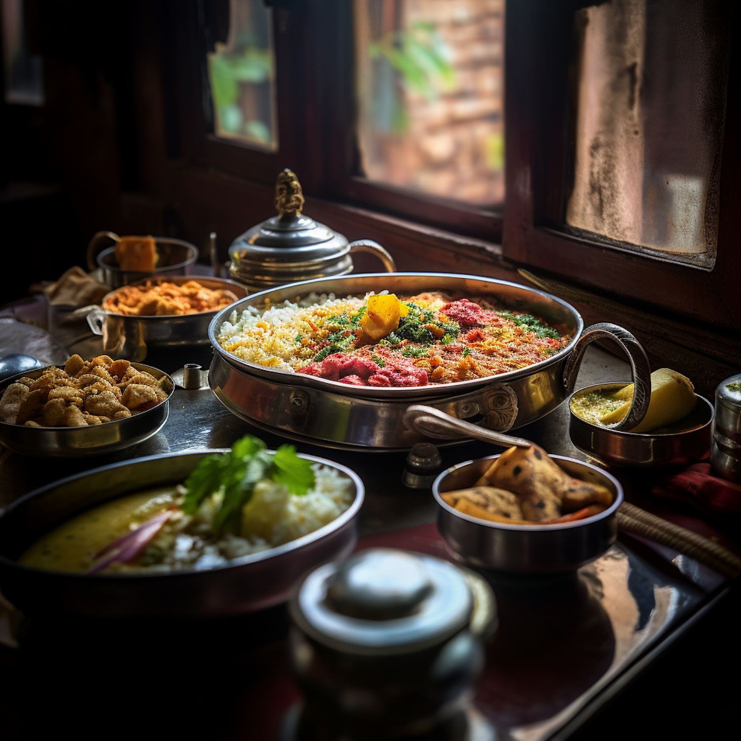 A colorful Indian meal with rice, curries, and snacks in traditional metal dishes by a window, creating an inviting dining scene.