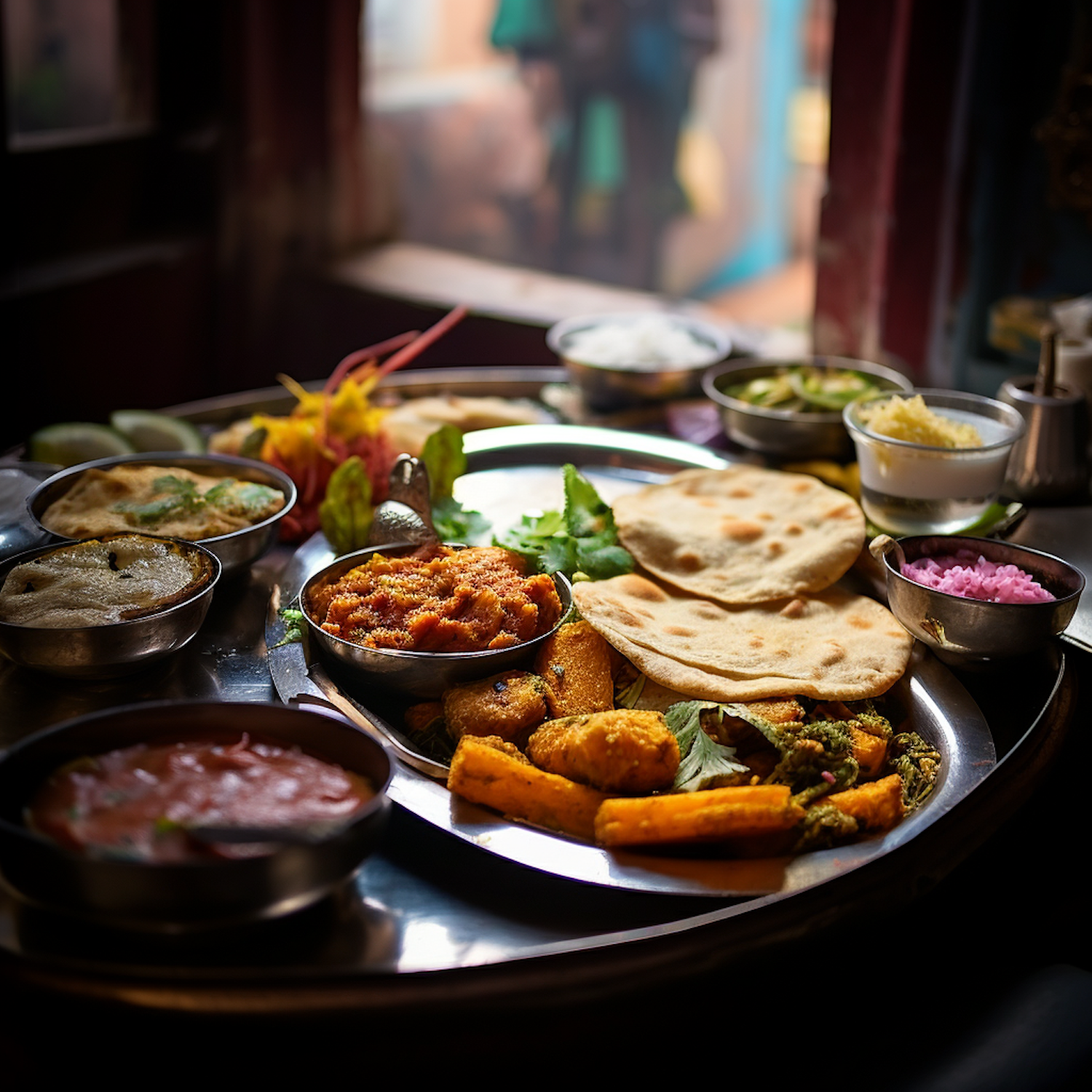A colorful Indian thali with various curries, vegetables, and flatbreads on a metal platter, set in a cozy dining setting.