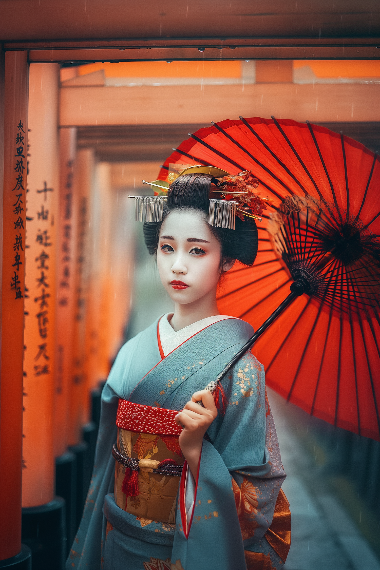 Elegant woman in traditional kimono with red parasol amidst orange torii gates, capturing serene beauty and cultural richness.