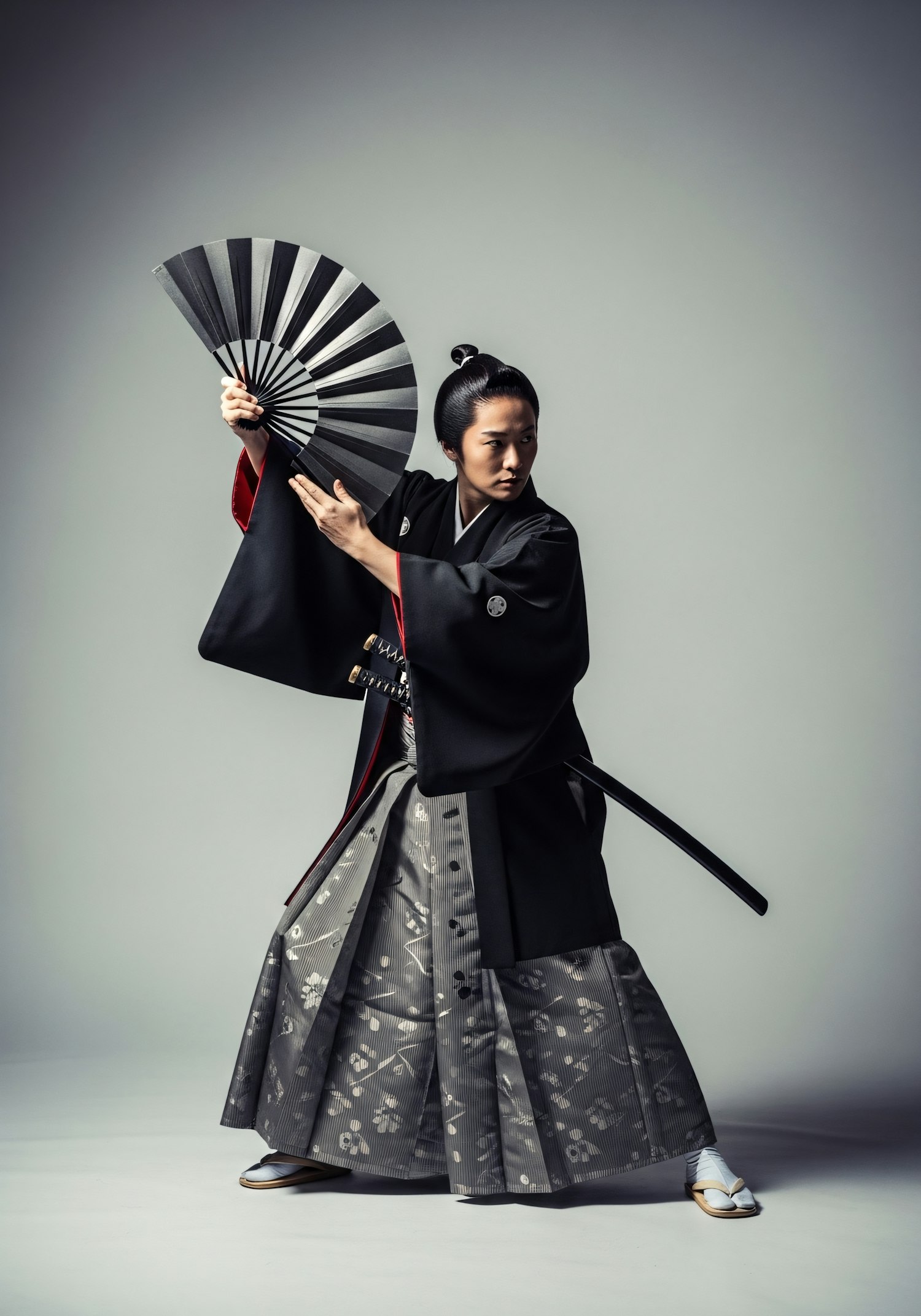 A person in traditional Japanese attire poses dynamically with a fan and katana, showcasing cultural elegance and focus.