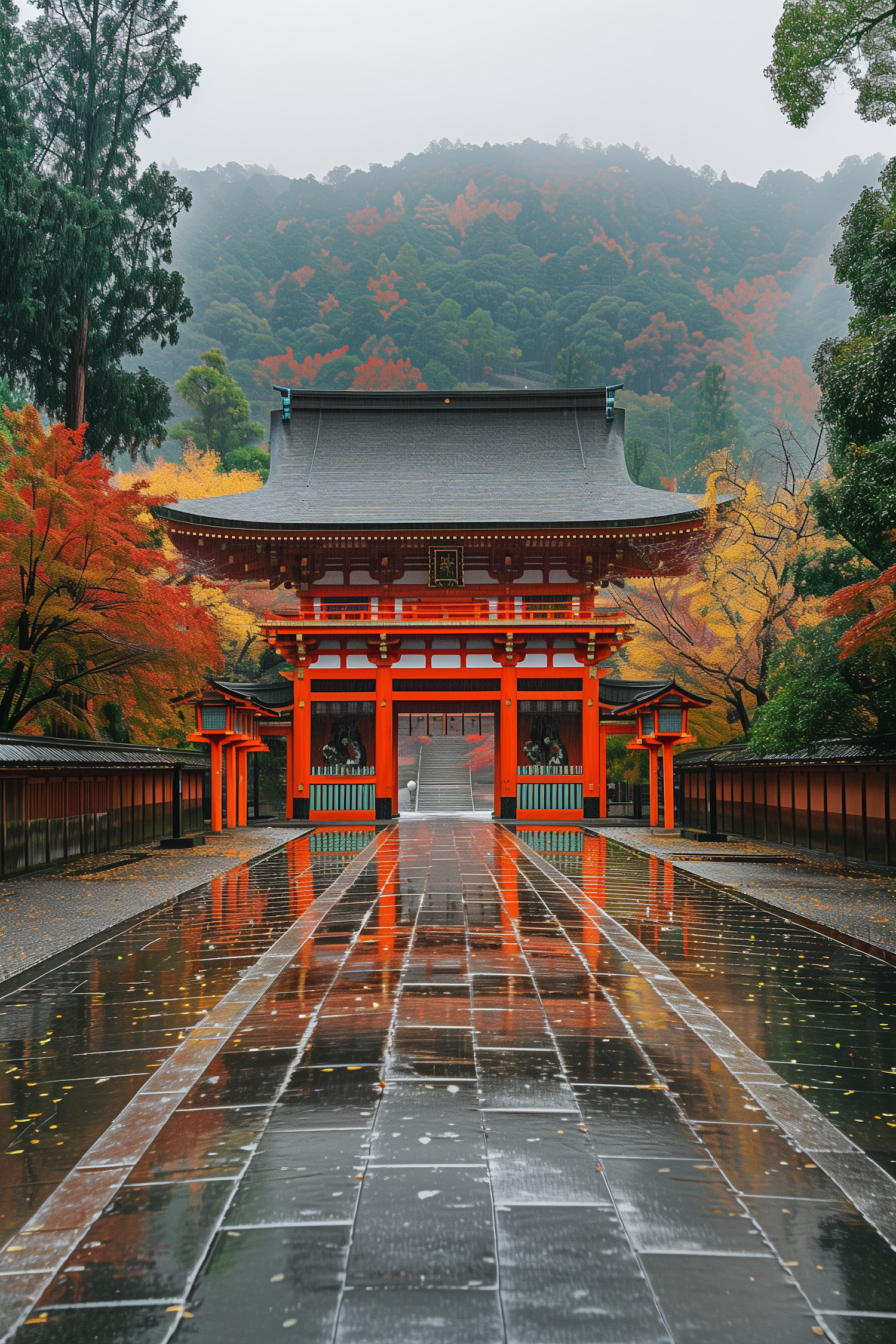 Vibrant red torii gate amidst colorful autumn foliage, reflecting on a wet pathway in a serene Japanese landscape.
