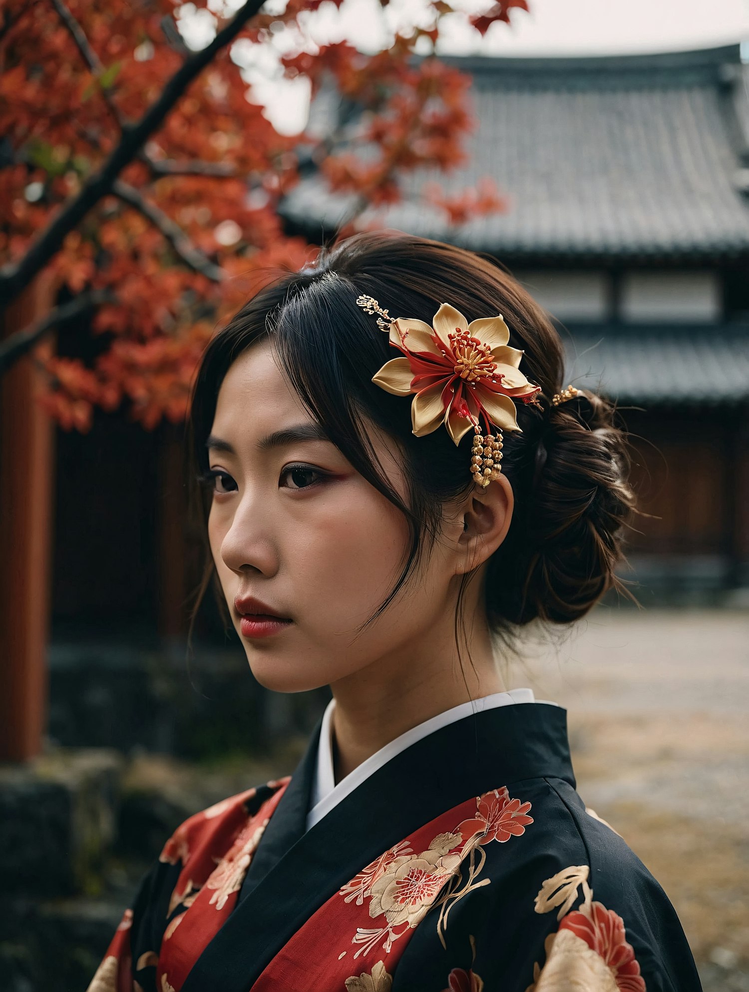 Asian woman in a floral kimono with a red and gold hairpiece, set against a backdrop of autumn leaves and traditional architecture.