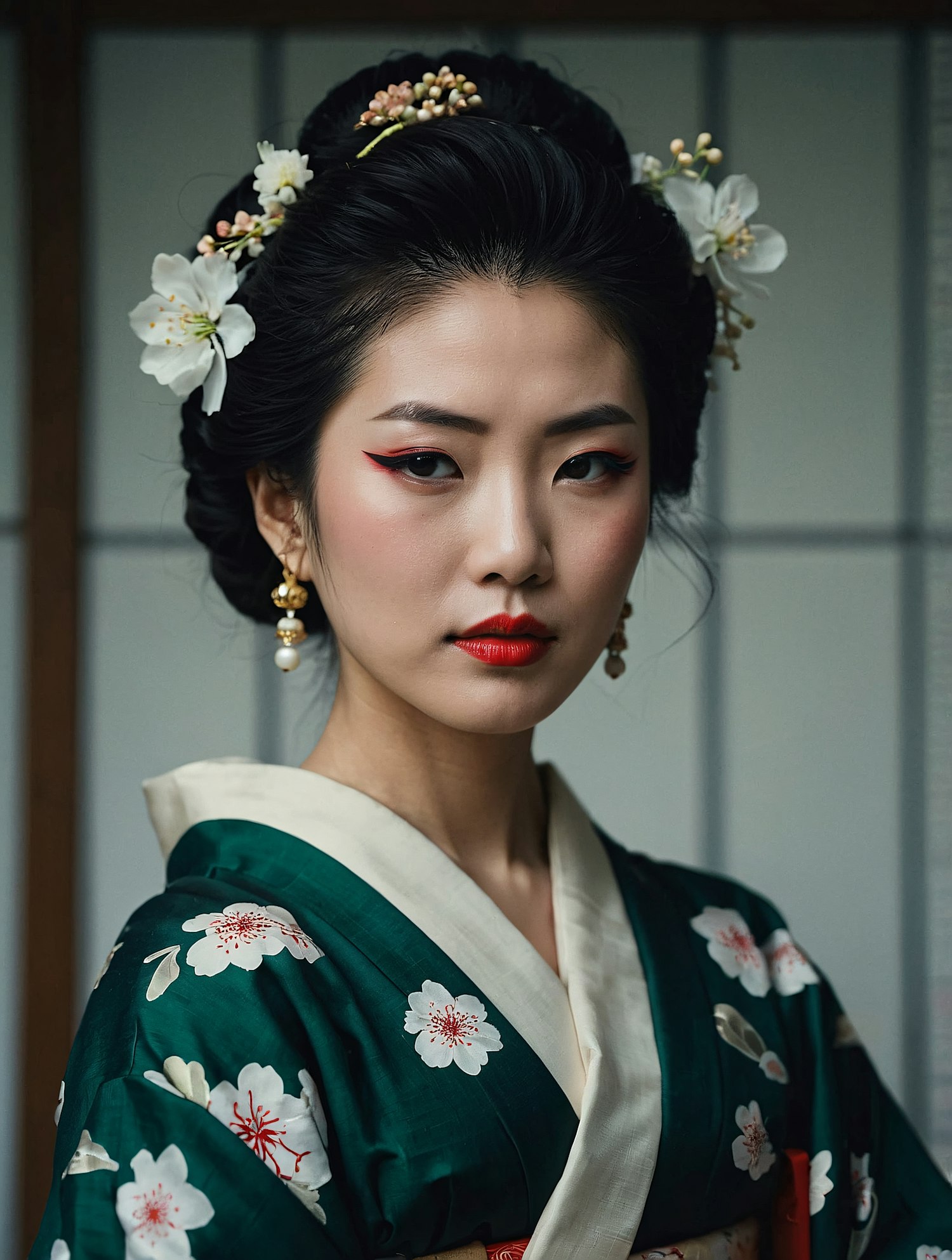 Asian woman in a floral kimono with elegant updo and bold makeup, exuding grace and tradition.
