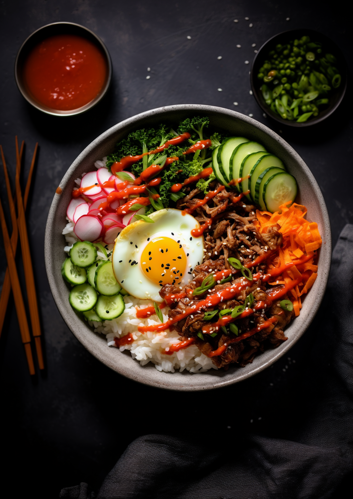 Colorful bibimbap bowl with egg, beef, fresh veggies, and spicy sauce. Perfectly garnished with sesame seeds and green onions.