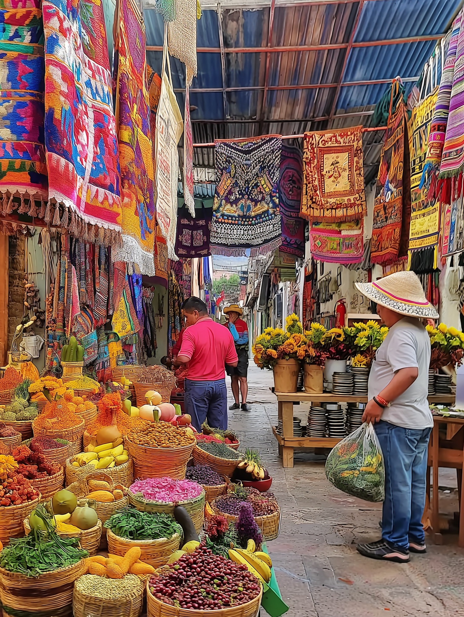 Colorful market with woven textiles, fresh produce, and flowers. Shoppers browse vibrant stalls under a rustic corrugated roof.