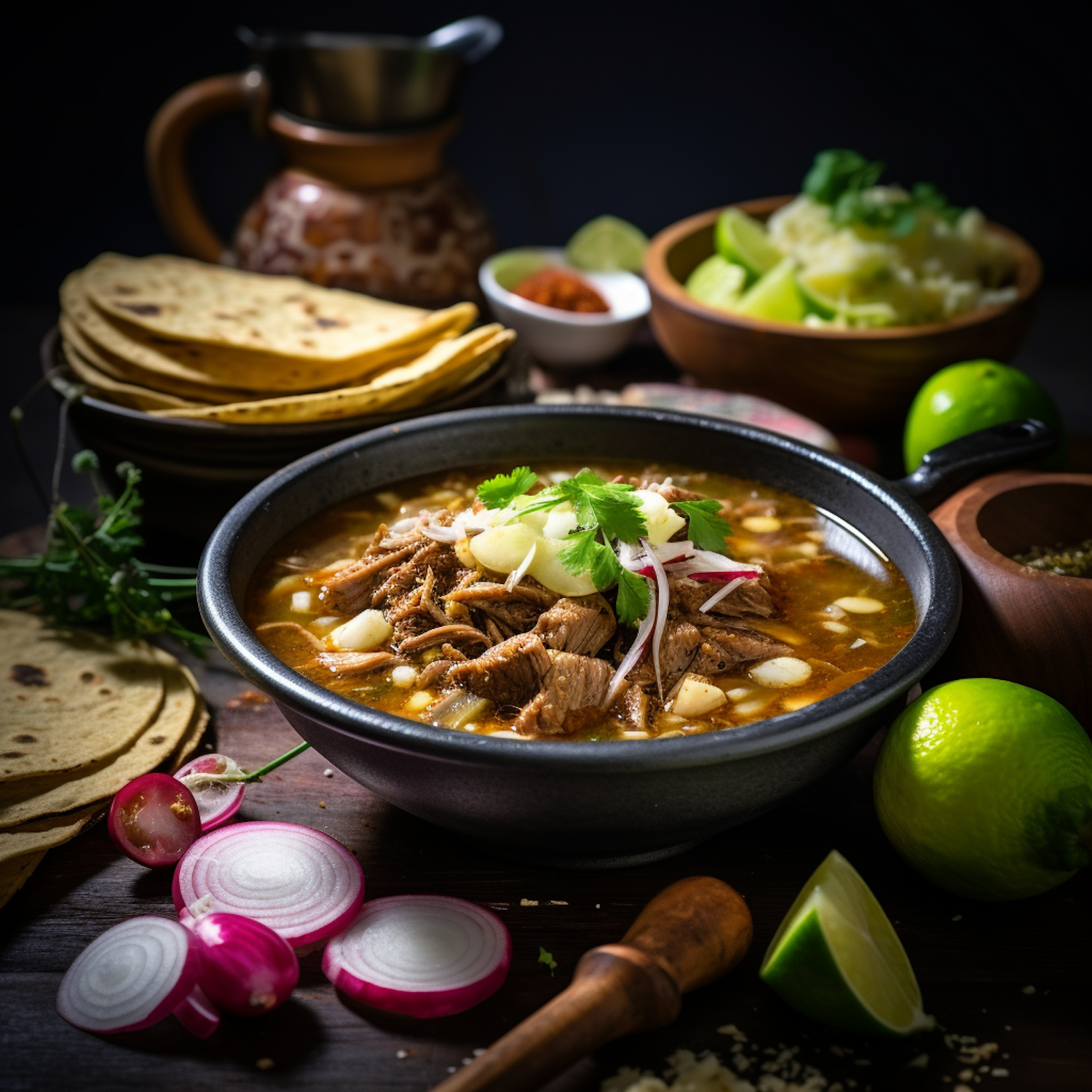 Delicious bowl of pozole with meat, hominy, and fresh garnishes, surrounded by tortillas, lime, and salsa on a rustic table.