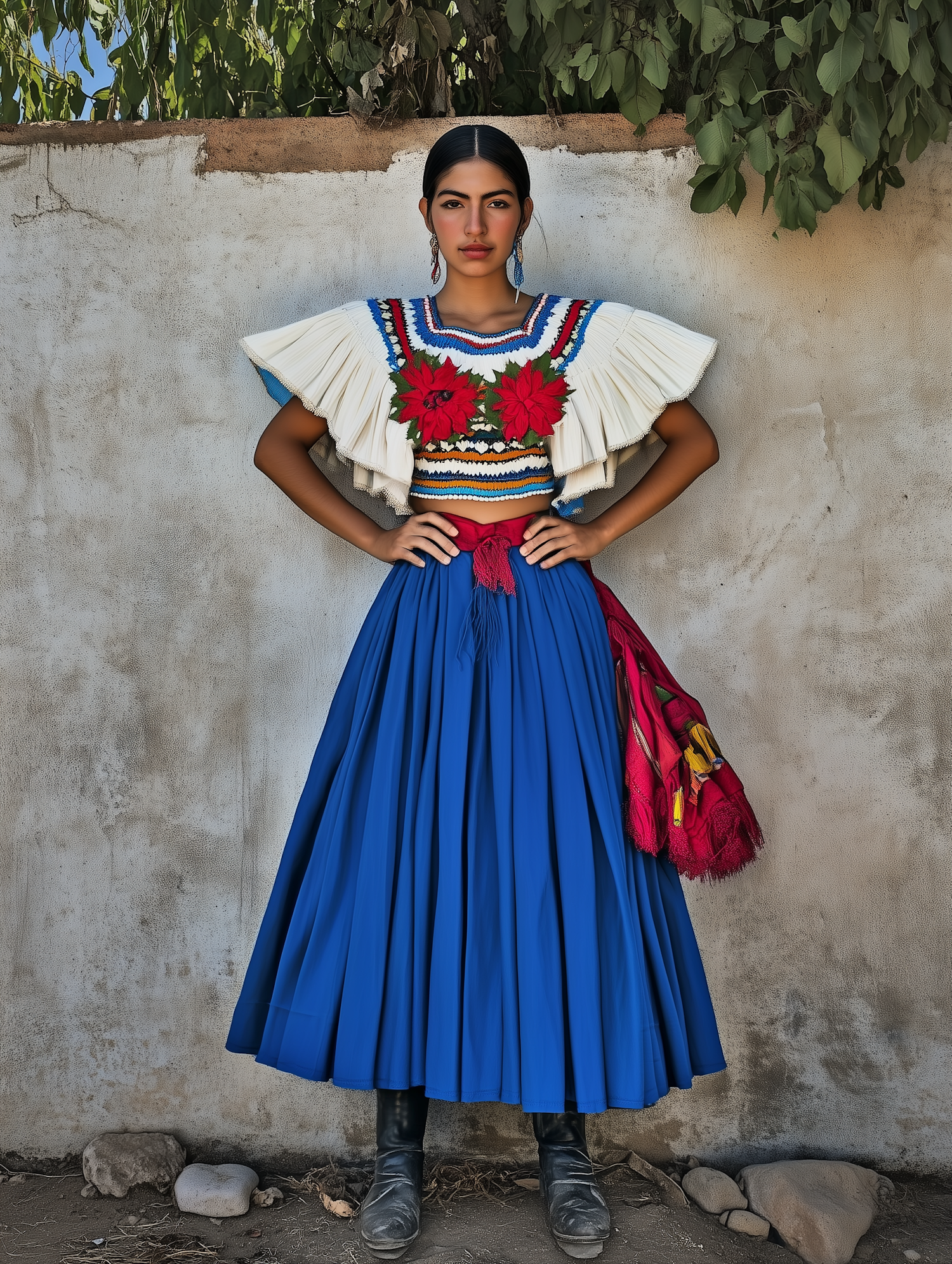 Woman in traditional attire with a blue skirt, embroidered blouse, and red sash, standing against a rustic wall with greenery.