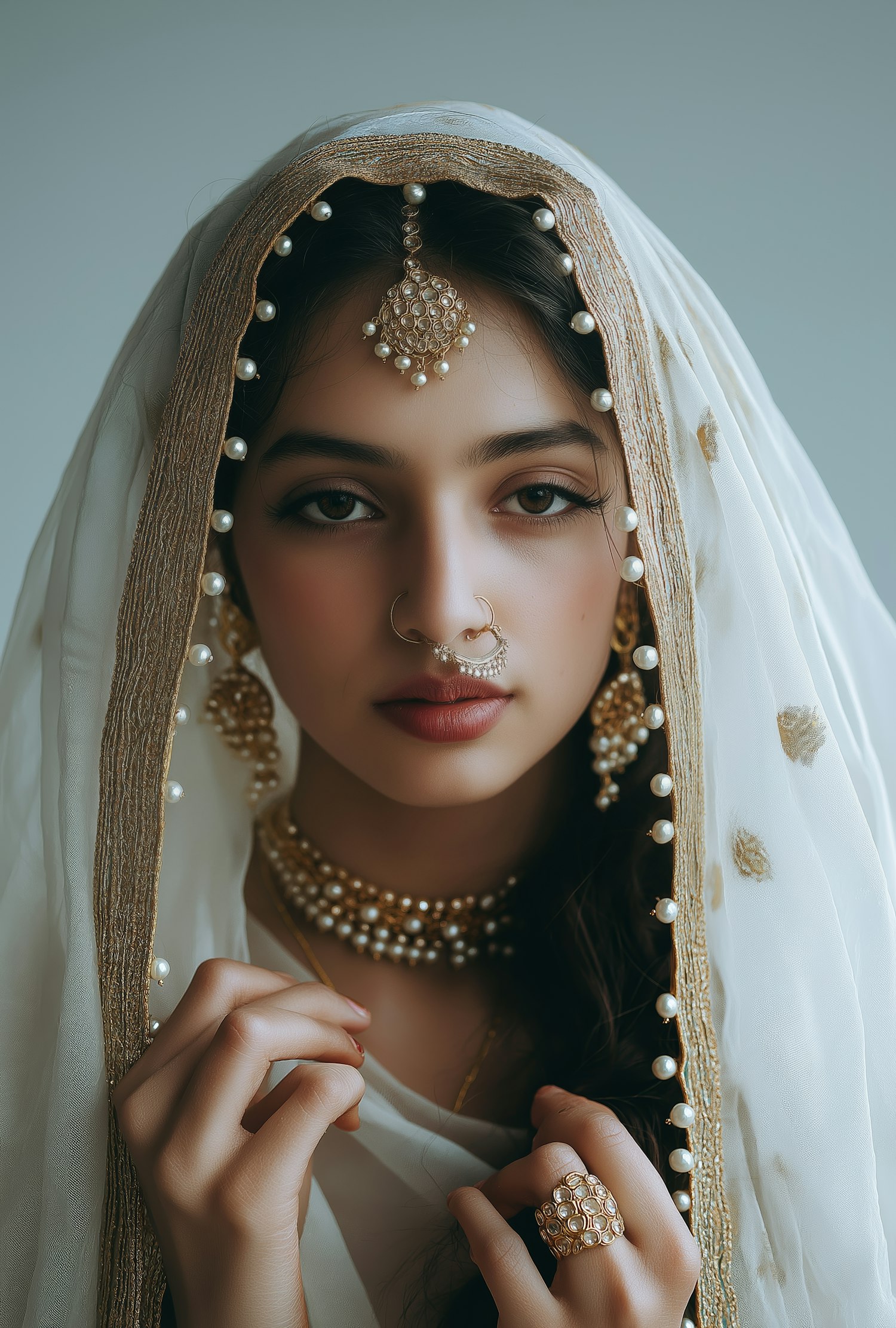 A close-up portrait of a woman in traditional attire with intricate jewelry and a white veil with golden embroidery.