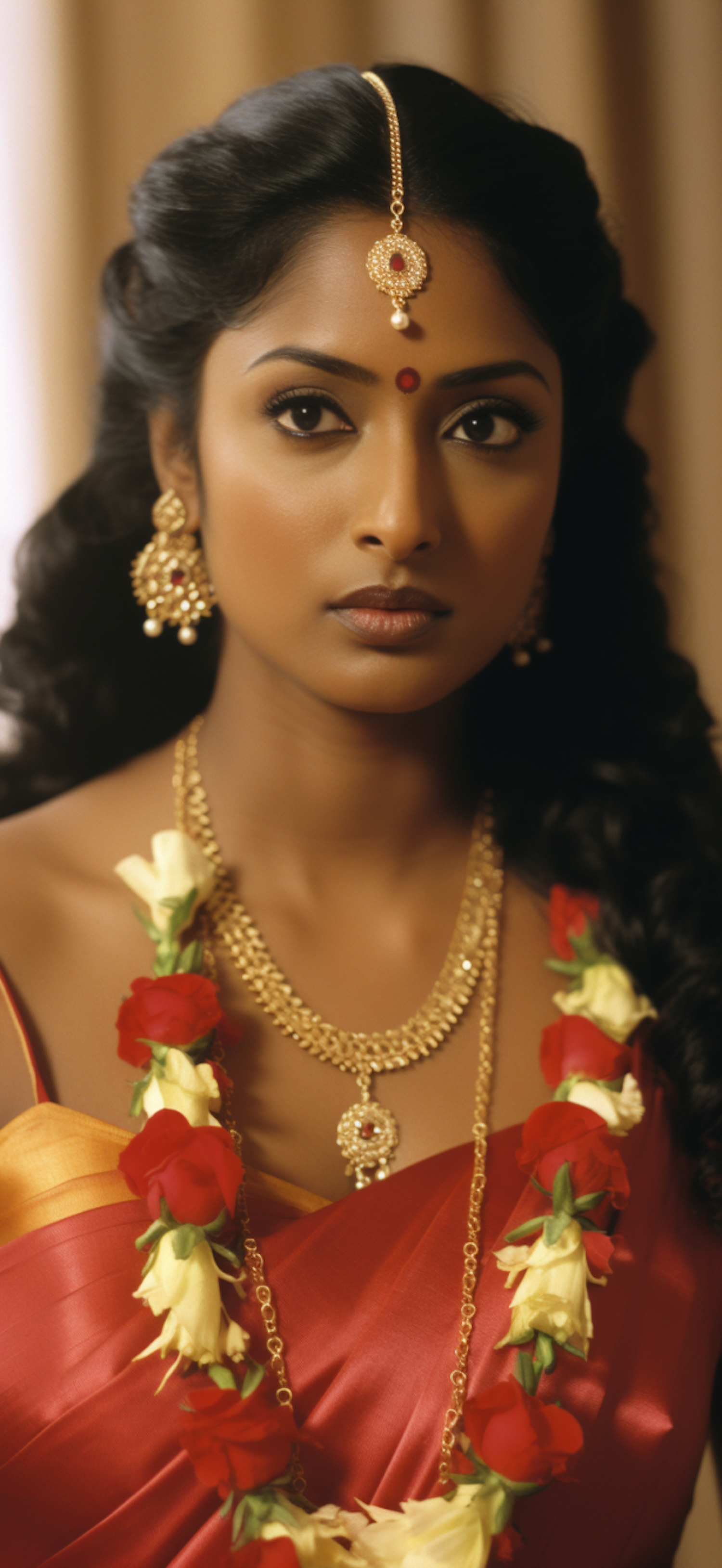 Elegant woman in traditional Indian attire with gold jewelry and floral garland, exuding grace and cultural richness.