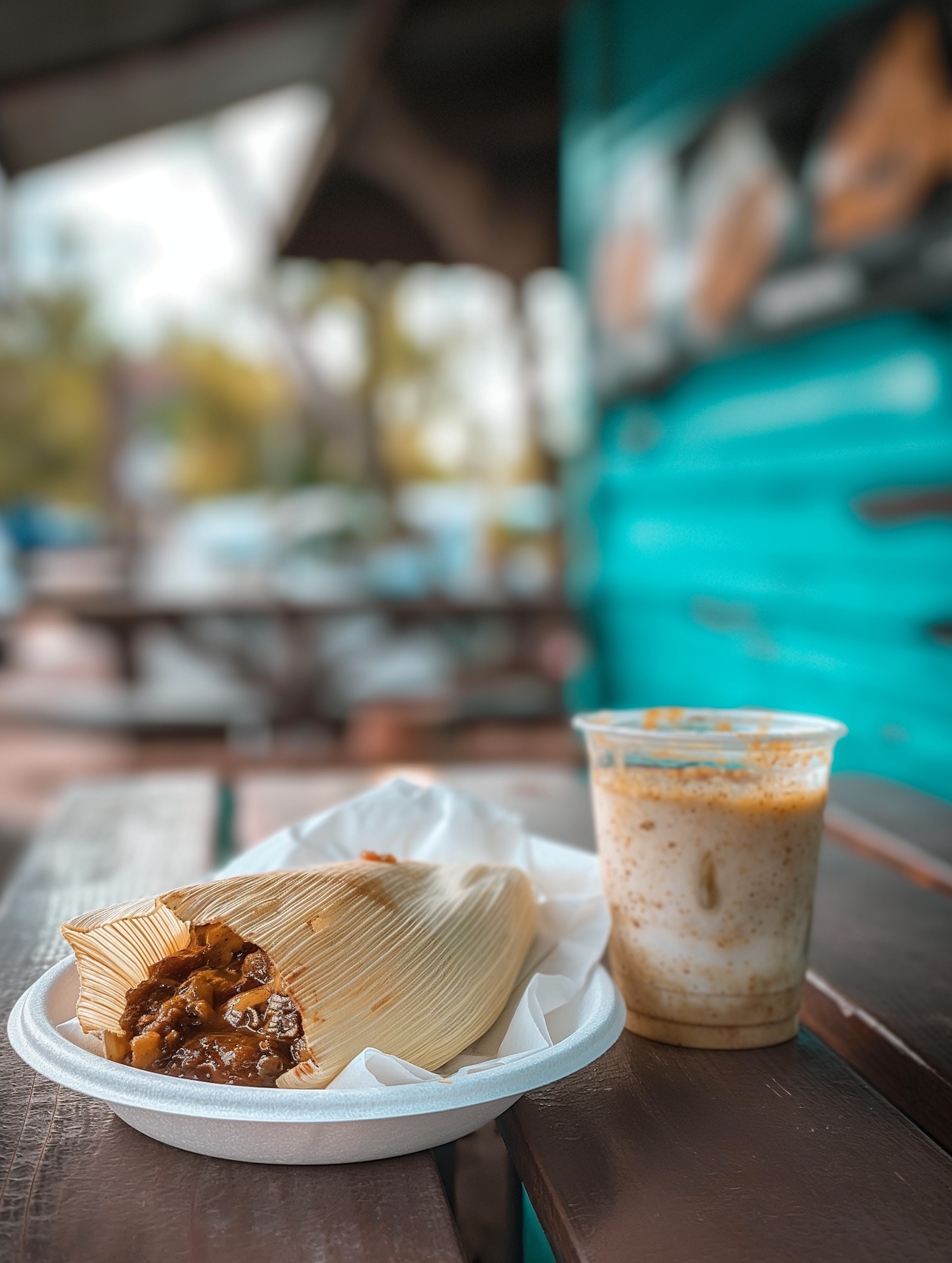 Close-up of a tamale with a savory filling and a creamy drink on a picnic table, set against a turquoise background.