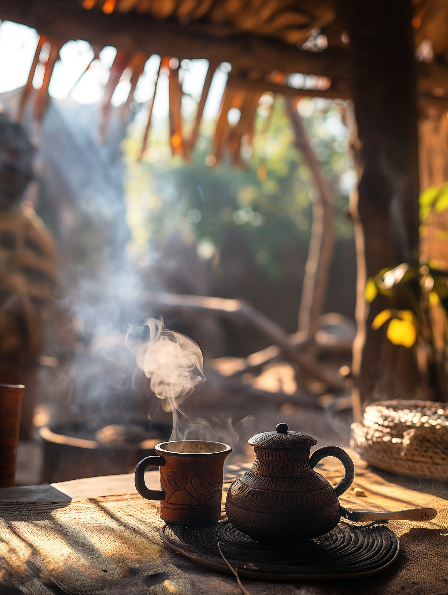 Rustic clay teapot and steaming cup on a sunlit table, surrounded by natural, cozy ambiance.