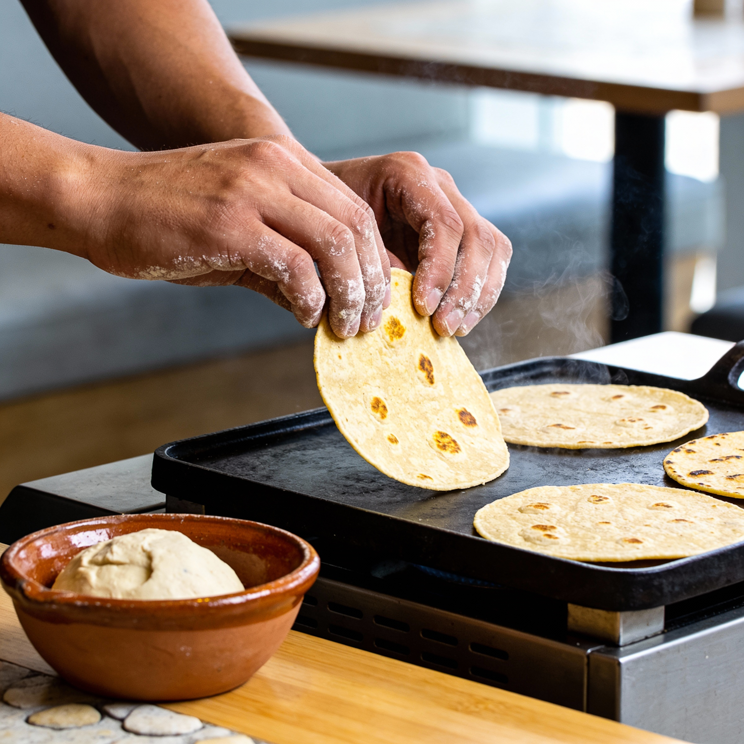 uthentic modern Mexican restaurant photo campaign, natural daylight, vibrant but realistic colors, true-to-life tones, casual restaurant photography, minimal contemporary styling, handmade ceramic plates, light wood table and pale stone textures, clean modern atmosphere, spontaneous candid feel, slight imperfections, no heavy editing, no cinematic grading, no film look, no cliché decorations tight close-up of hands flipping fresh corn tortillas on a hot flat grill, subtle steam rising, golden toasted spots on the tortillas, small bowl of dough nearby, flour dust on fingertips, warm authentic cooking gesture, background softly blurred