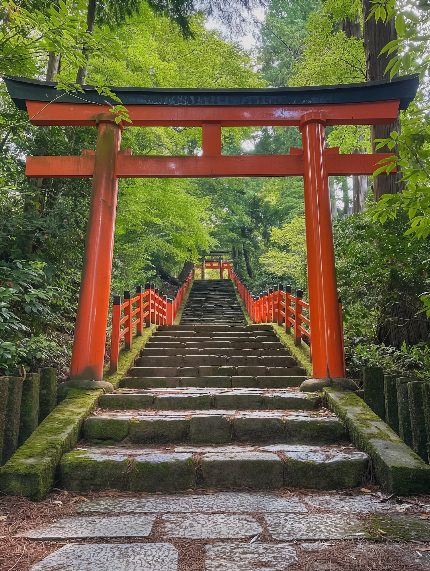 Red torii gate and moss-covered stone steps lead through a lush green forest, creating a serene and inviting atmosphere.