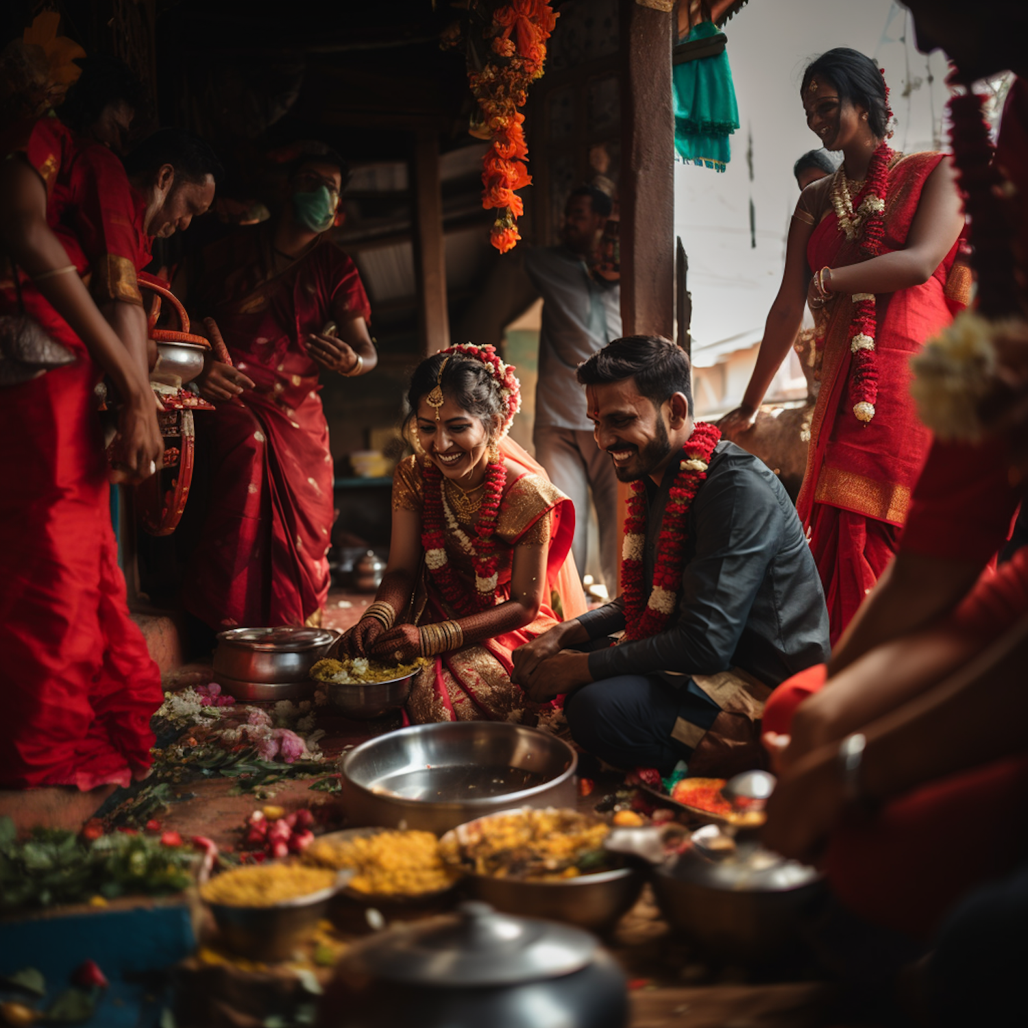 Joyful Indian wedding ceremony with bride and groom in traditional attire, surrounded by vibrant colors and cultural rituals.