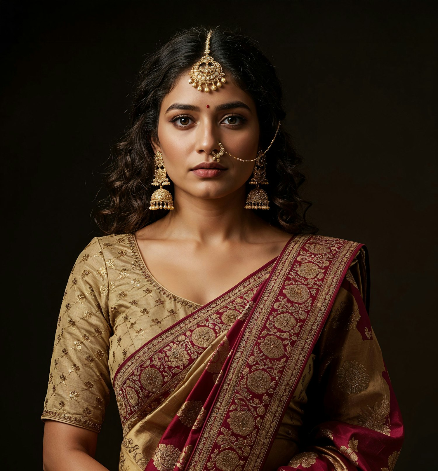 Elegant woman in gold and maroon saree with intricate embroidery, adorned with traditional Indian jewelry and a red bindi.
