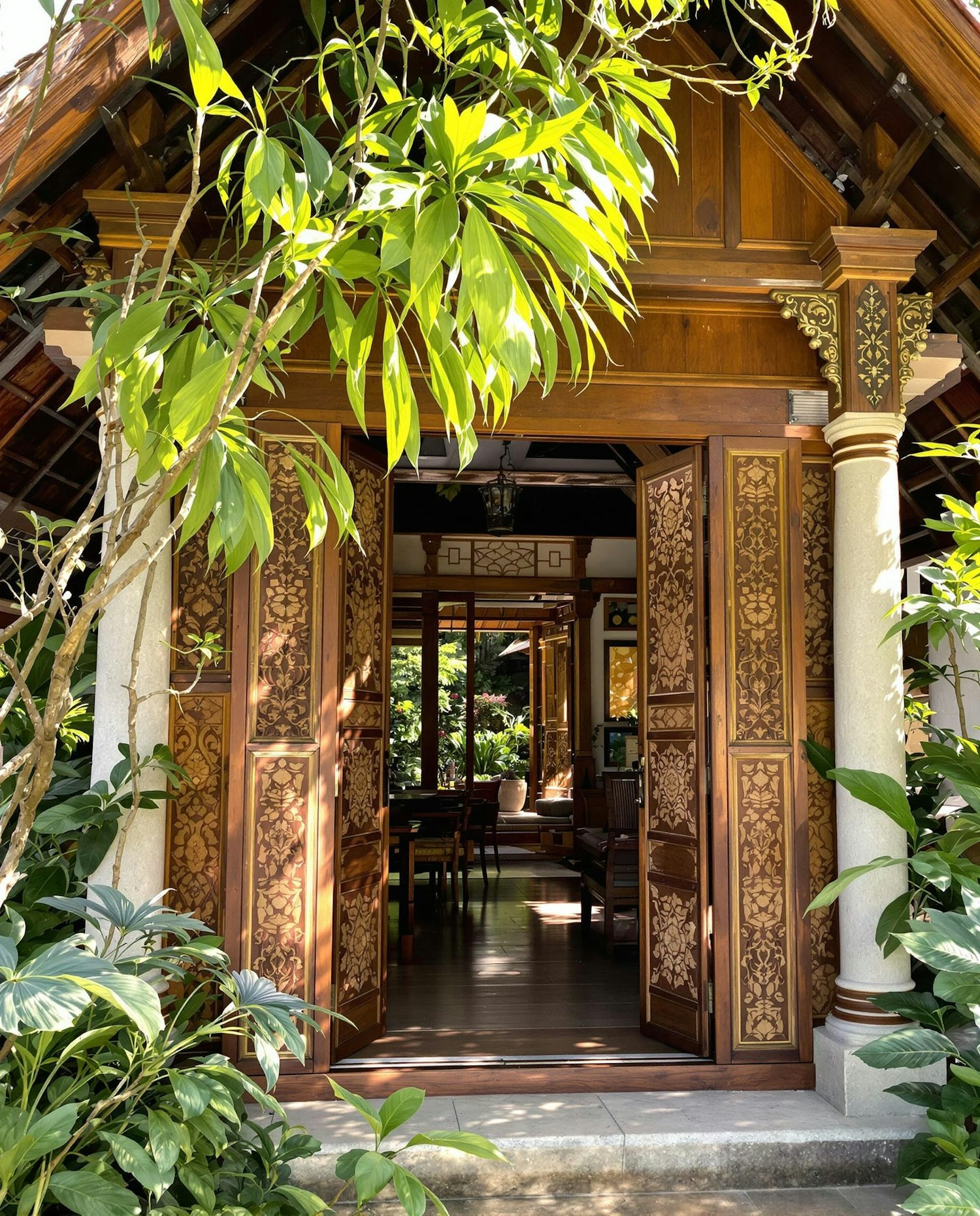 Balinese wooden home with an open-air layout, carved doors and tropical plants. Photographed during late afternoon with dappled sunlight and earthy tones.