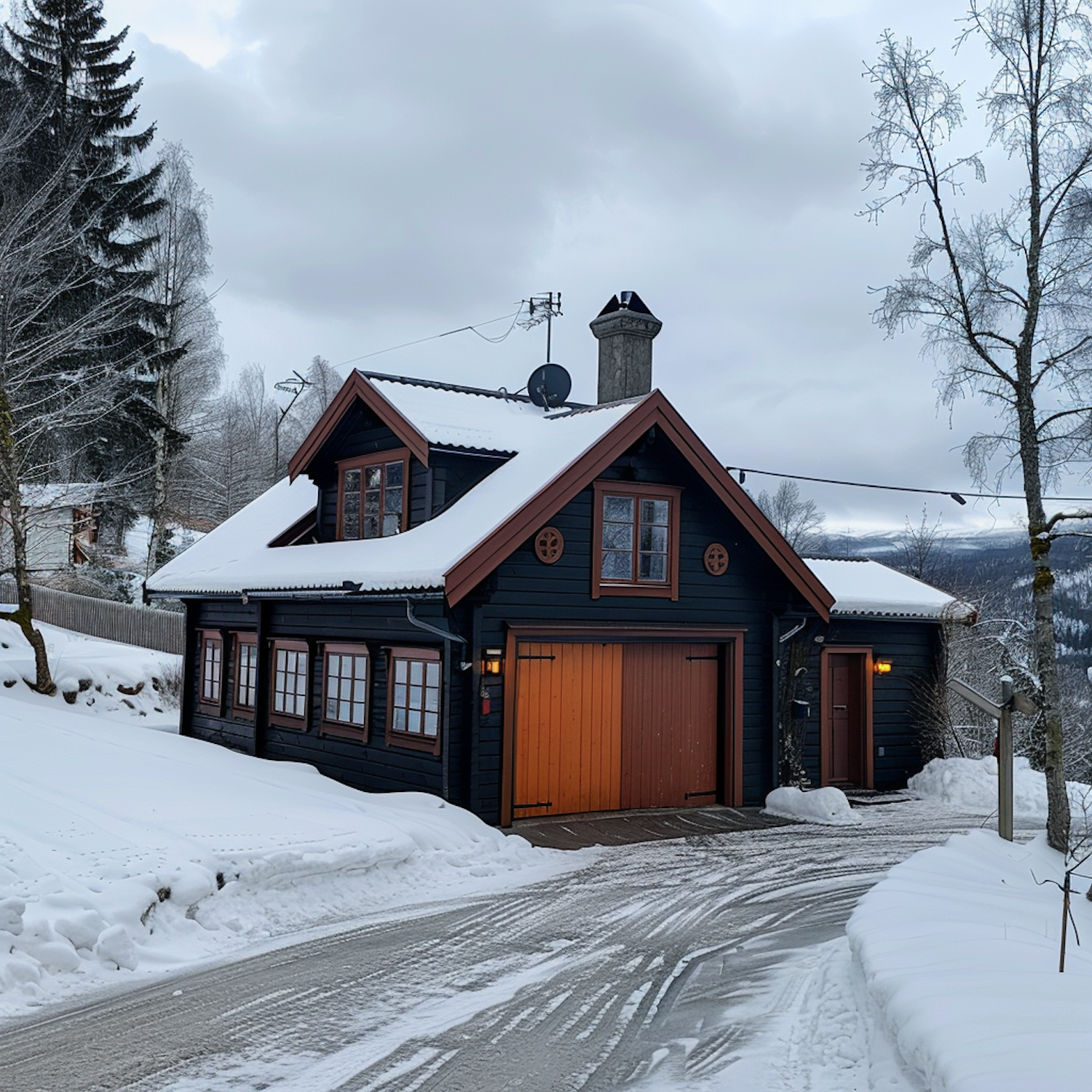 Charming wooden house in snowy landscape with dark exterior, warm brown accents, and cozy winter ambiance.