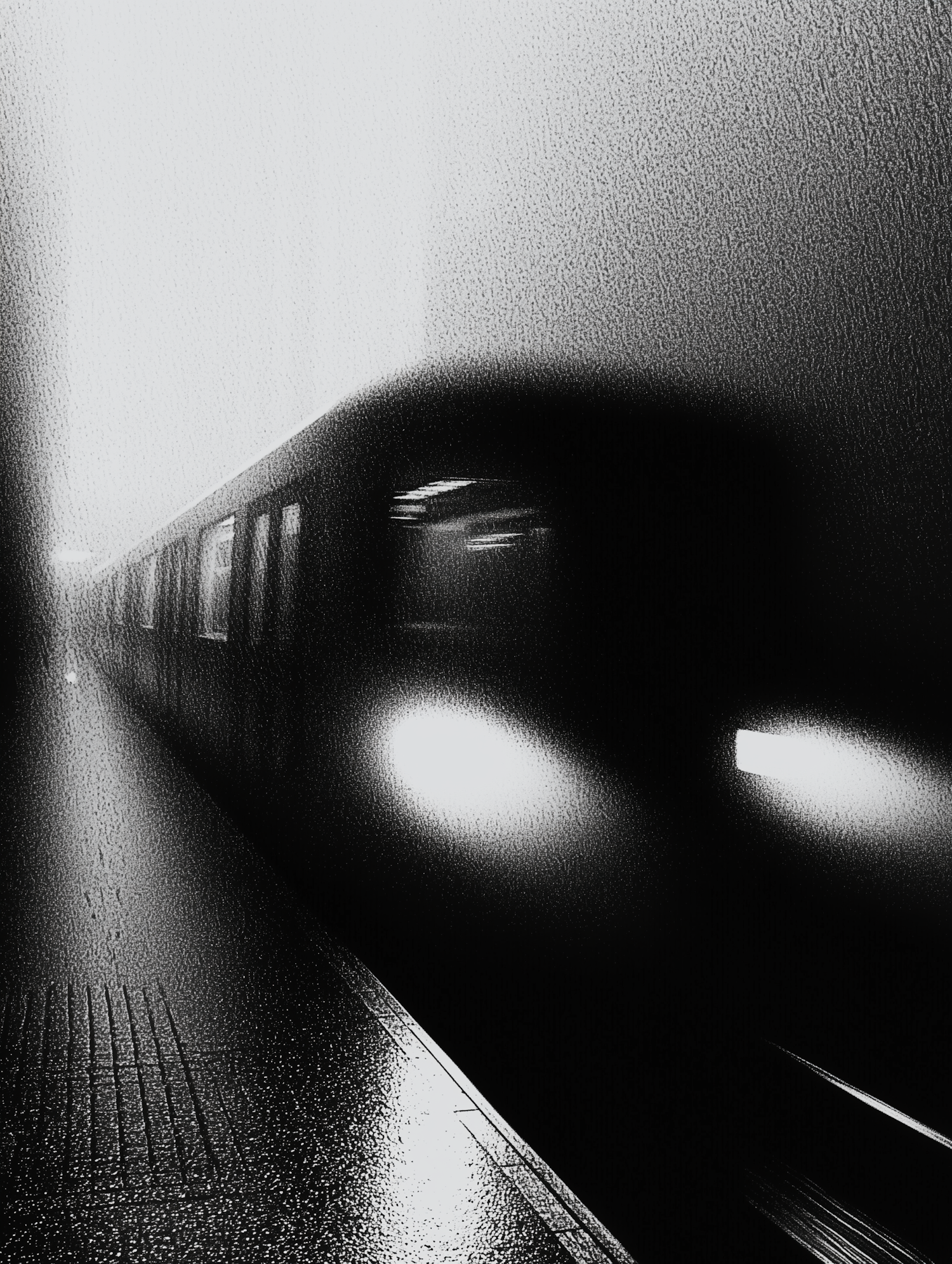 Moody black and white image of a subway train in motion, with bright headlights and a wet platform reflecting light.