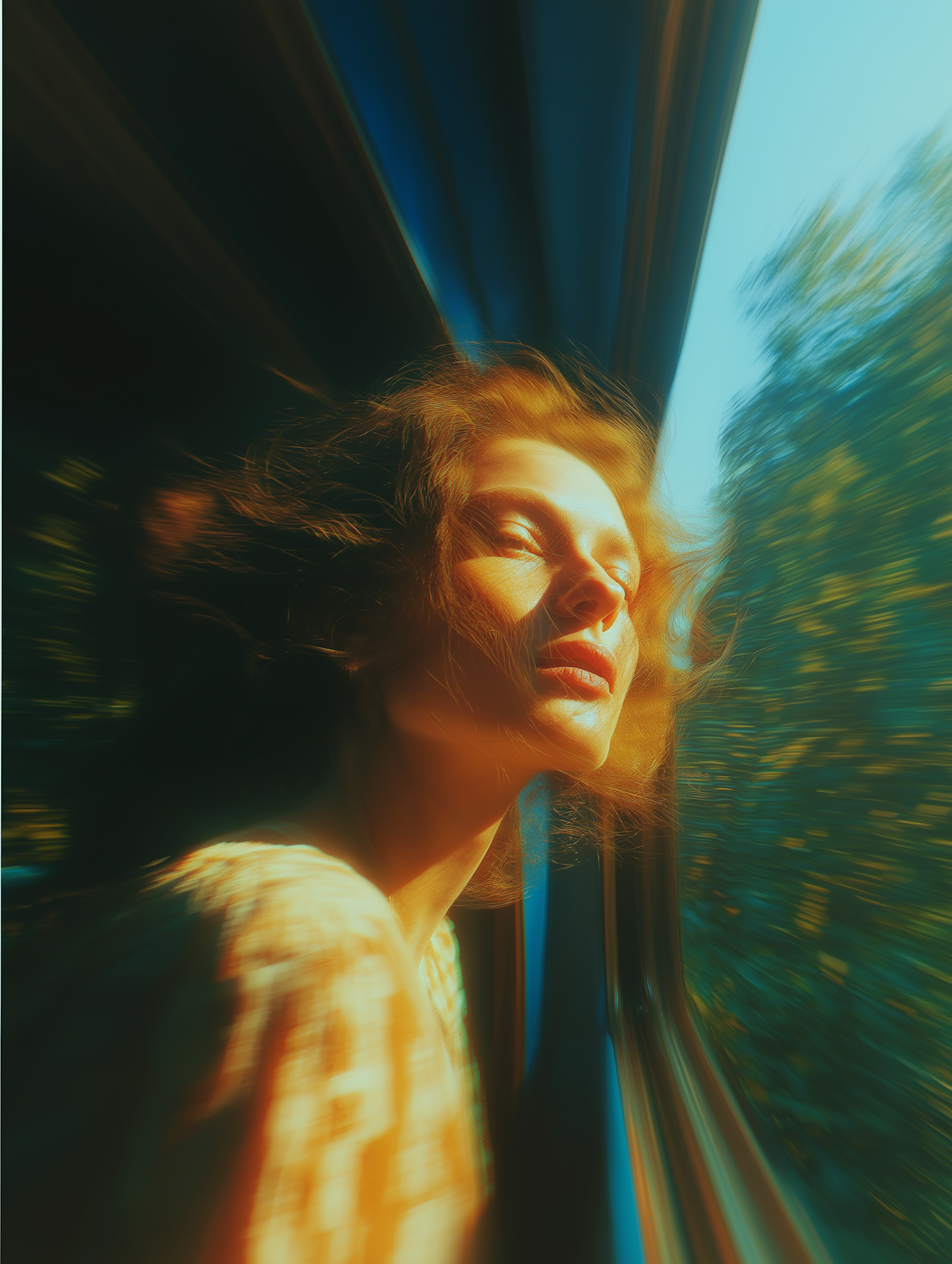 A serene moment of a woman leaning out of a train window, her face lit by sunlight, with blurred greenery in the background.