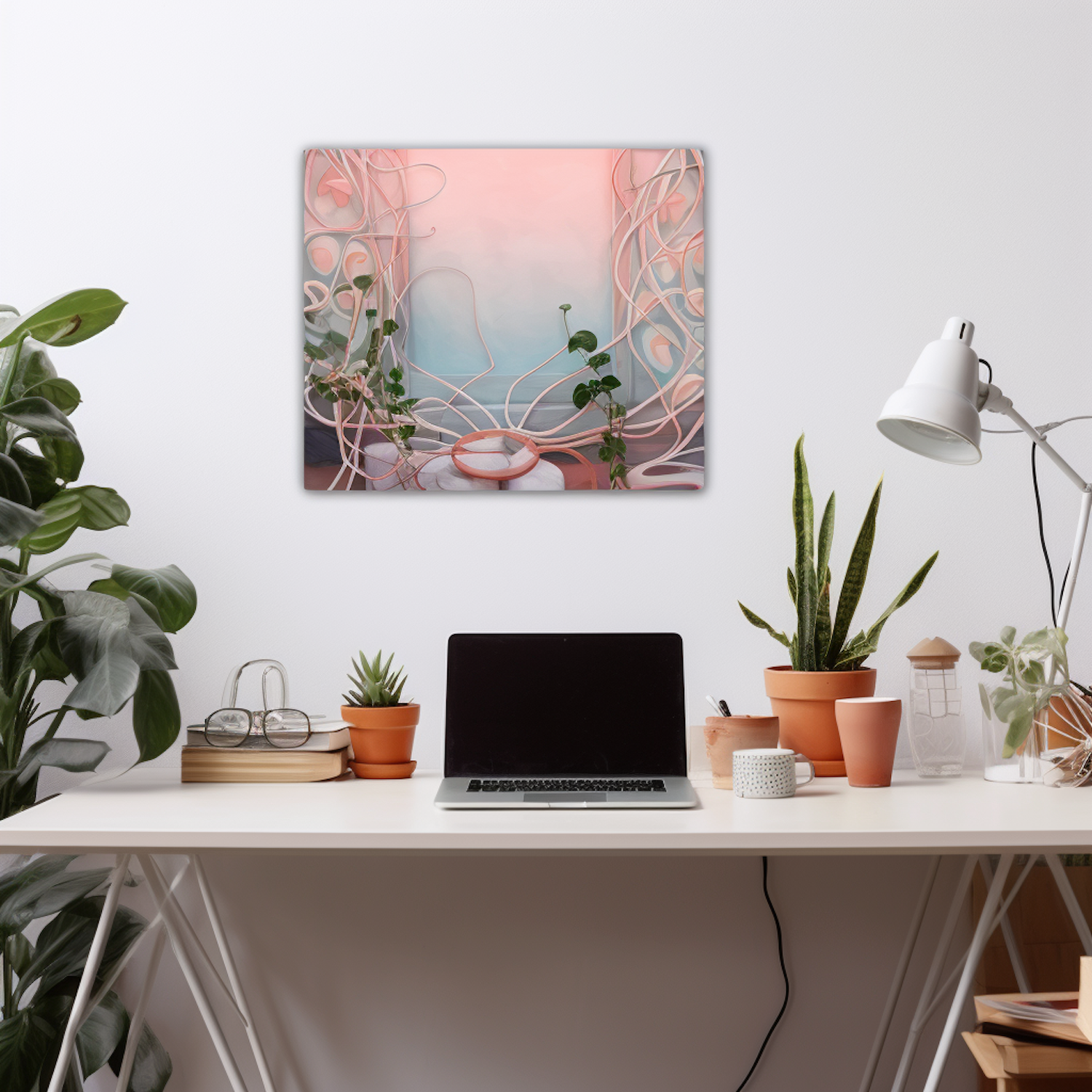 Modern workspace with a white desk, laptop, potted plants, and abstract art on the wall, creating a calm and creative atmosphere.