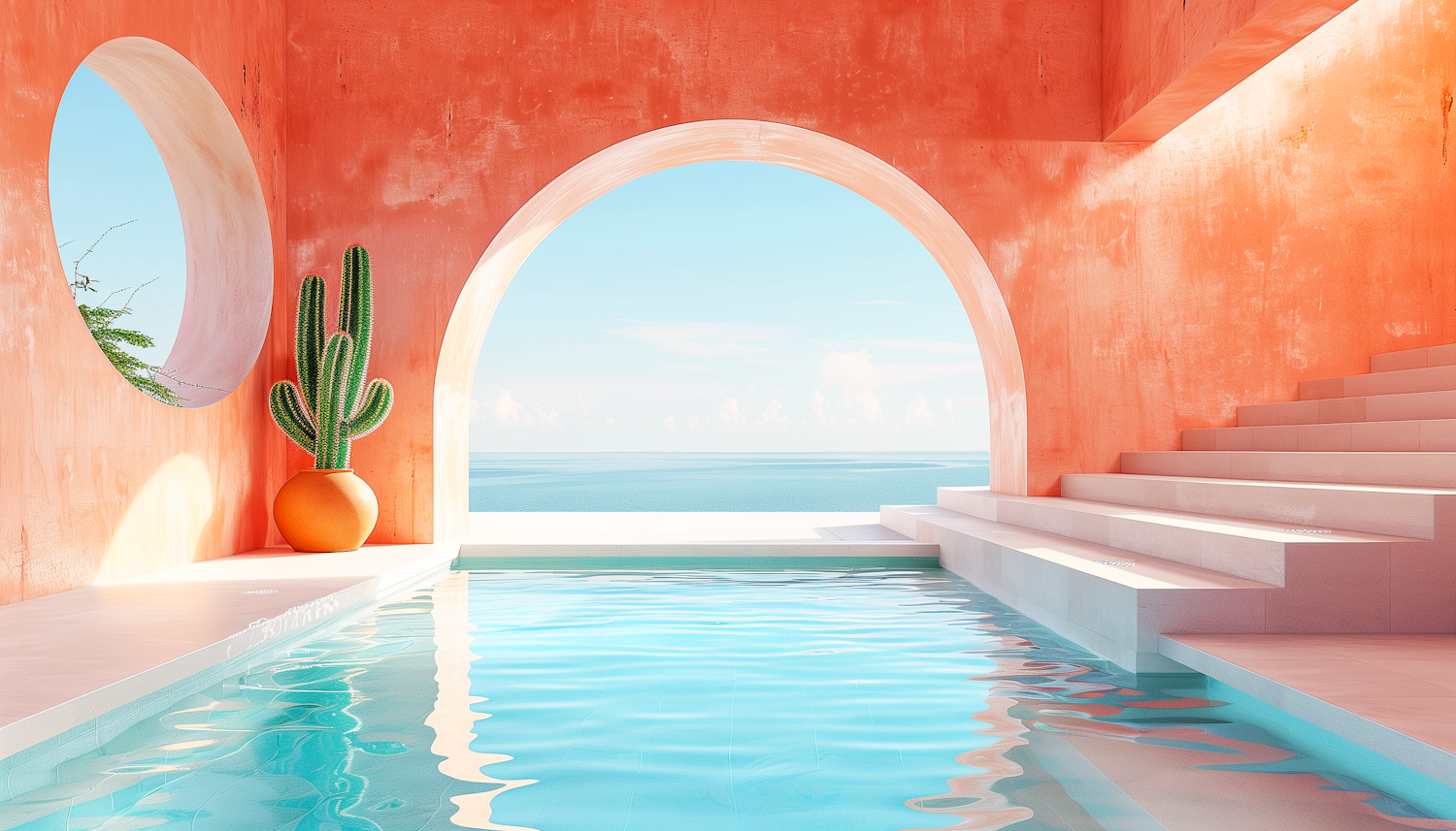 Modern architecture with orange walls, a cactus, and a pool overlooking the ocean. Bright and serene coastal design.