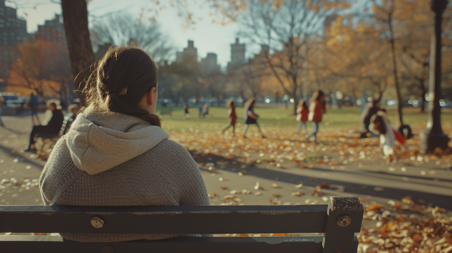 Woman in gray sweater sits on a park bench, overlooking a sunny autumn park with scattered leaves and people enjoying the day.