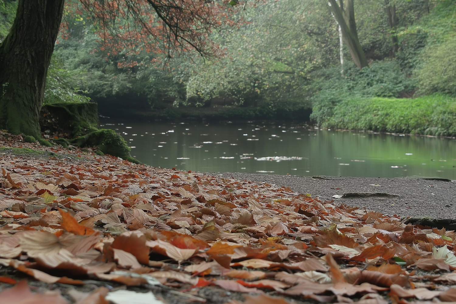 Tranquil autumn scene with fallen leaves, a mossy tree, and a serene pond reflecting lush greenery.