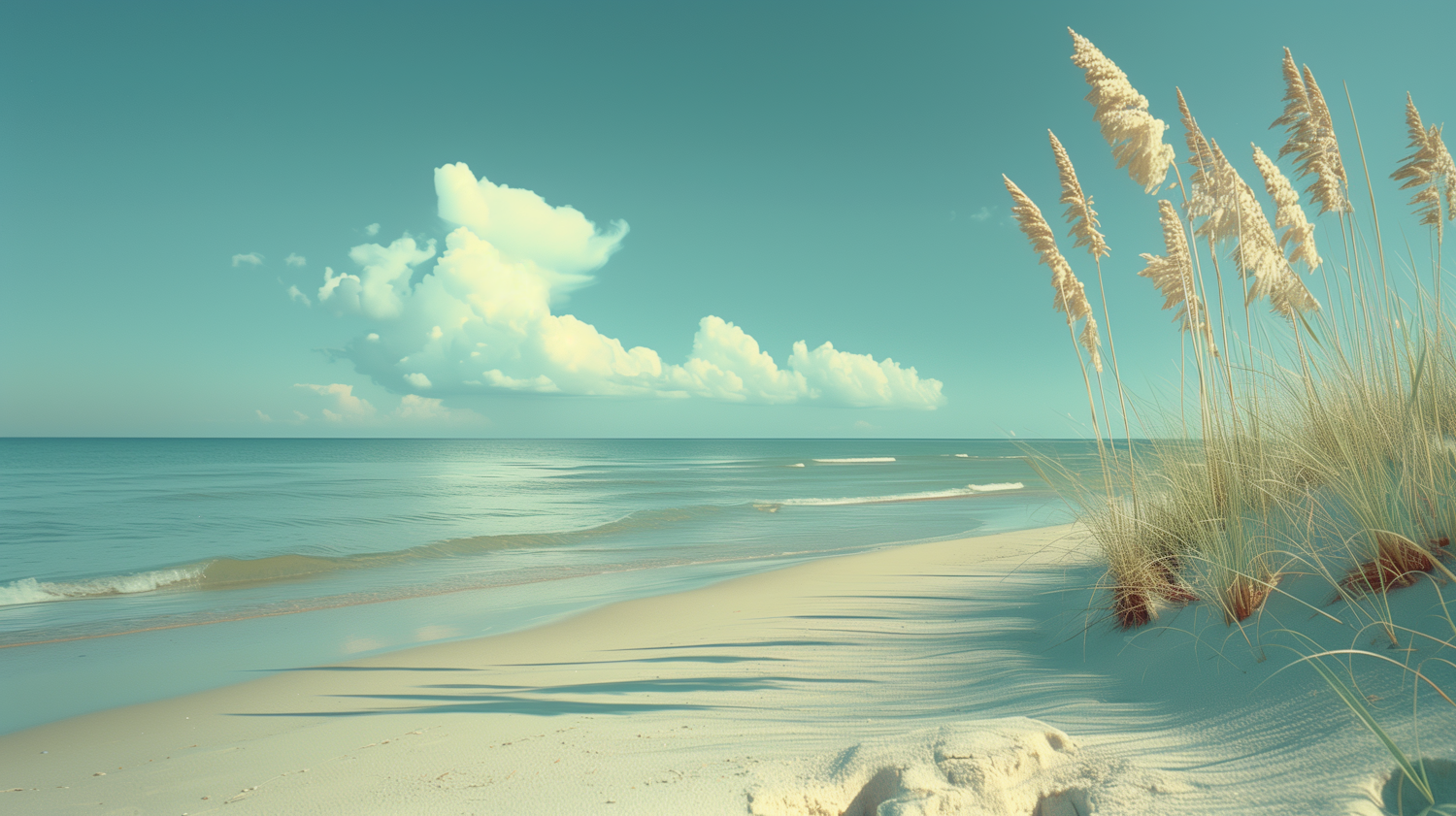 Tranquil beach scene with turquoise sky, fluffy clouds, and gentle waves. Tall grasses sway on the sandy shore, creating a serene atmosphere.