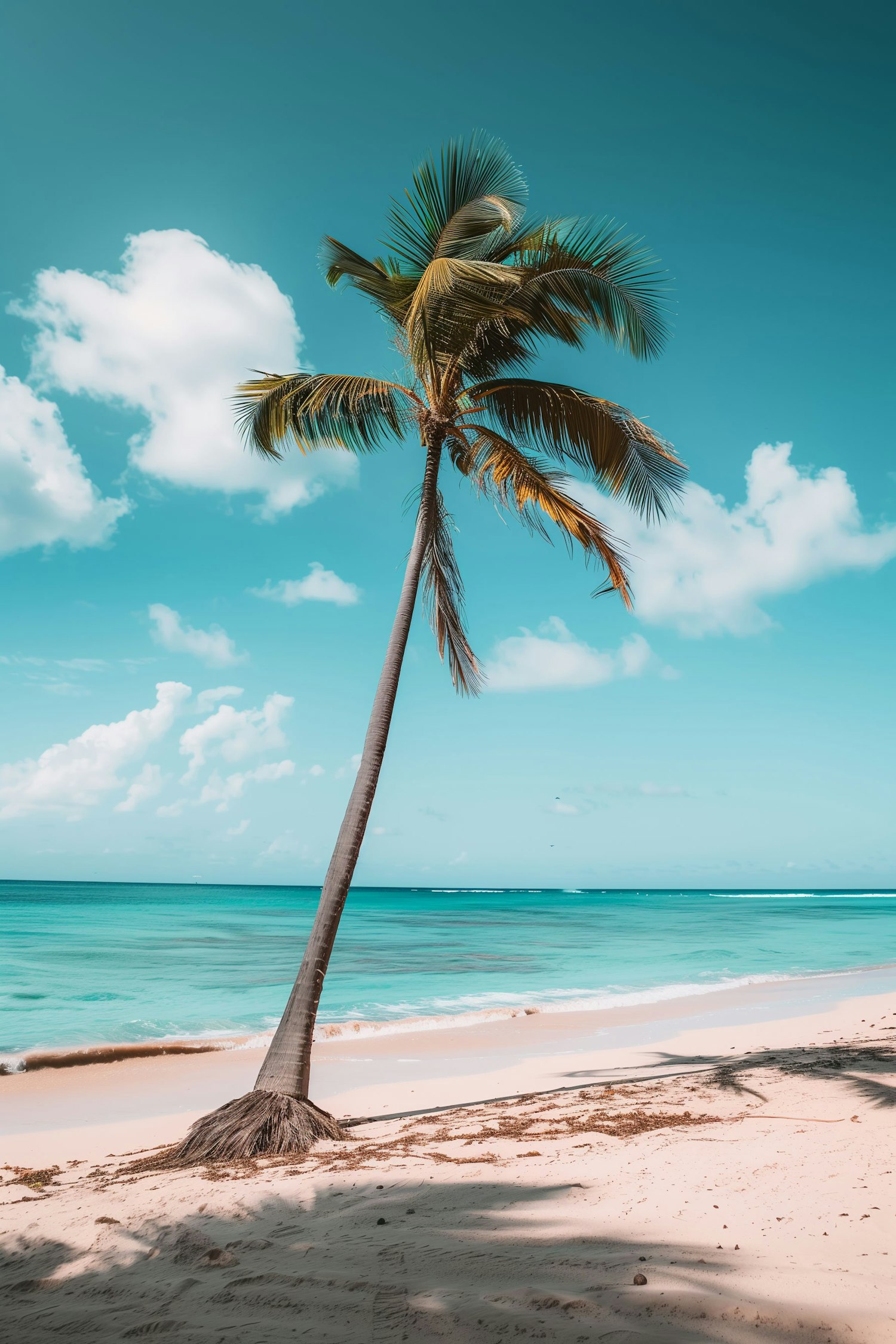 A lone palm tree on a pristine beach with turquoise waters and a clear blue sky, creating a serene tropical paradise.