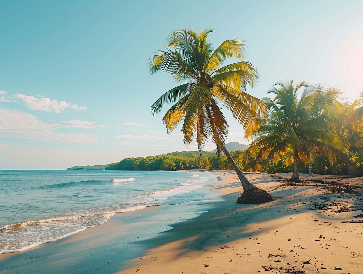 Idyllic tropical beach with golden sand, leaning palm trees, and a calm turquoise sea under a clear blue sky.