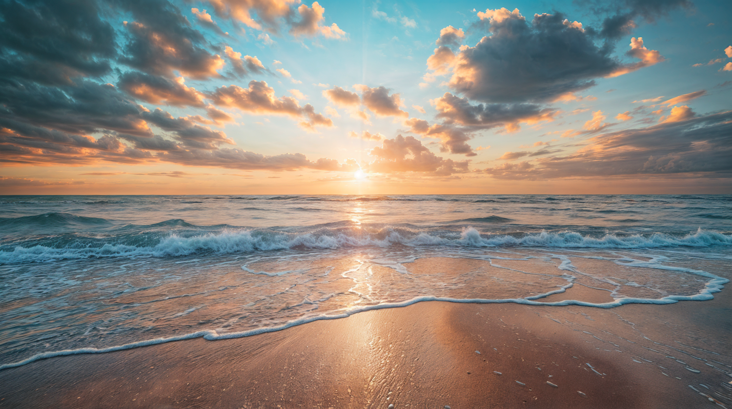 Stunning sunset over a tranquil beach with vibrant skies and gentle waves, creating a serene and inviting atmosphere.