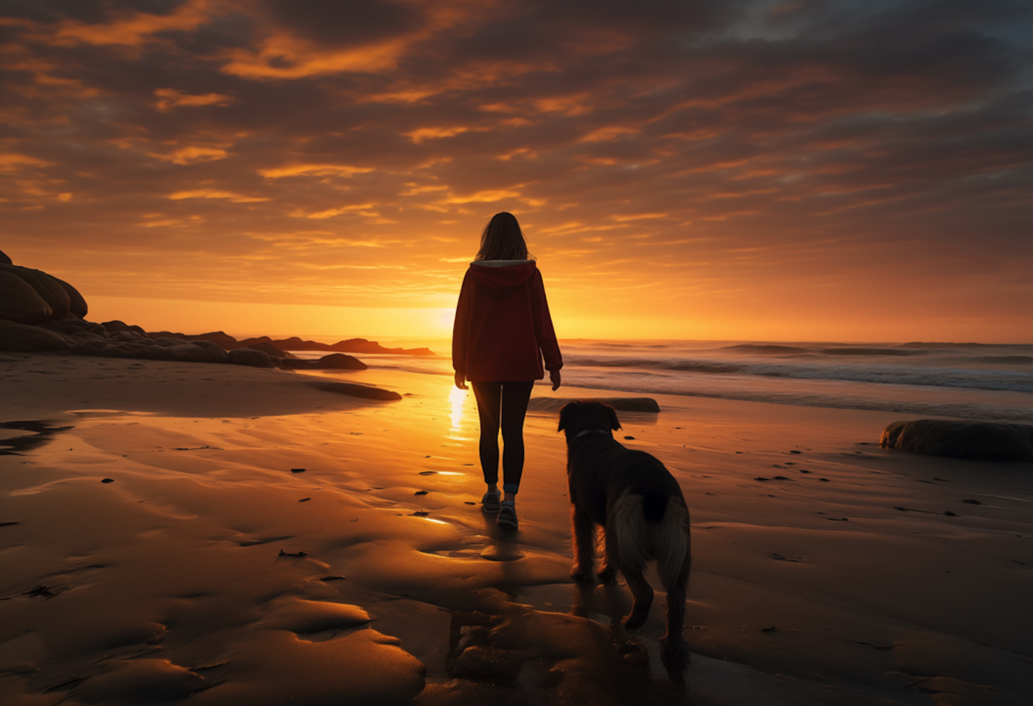 A person and a dog walk on a beach at sunset, with vibrant orange skies and reflections on the wet sand creating a serene scene.