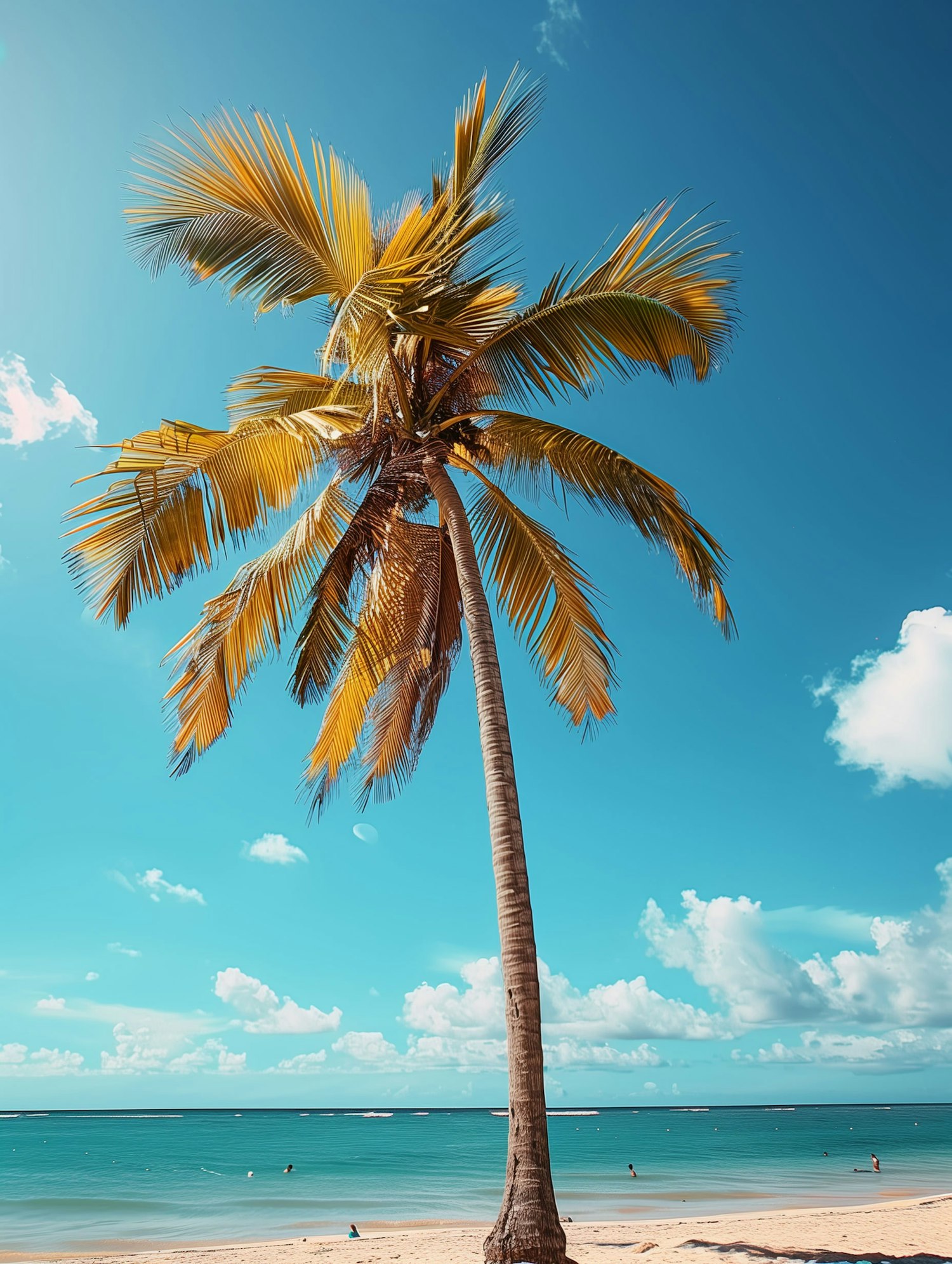 Golden-green palm tree on a sandy beach with turquoise ocean and bright blue sky, perfect for a tropical getaway vibe.