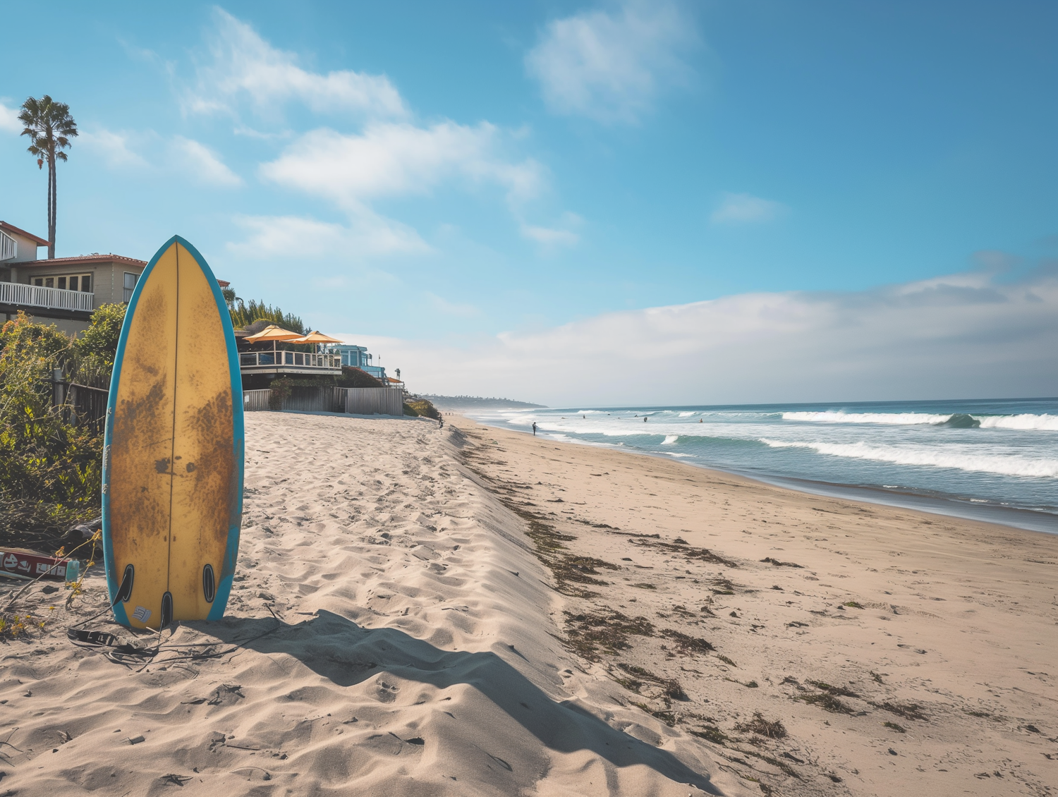 Golden surfboard on a sandy beach with ocean waves and beach houses under a clear blue sky.