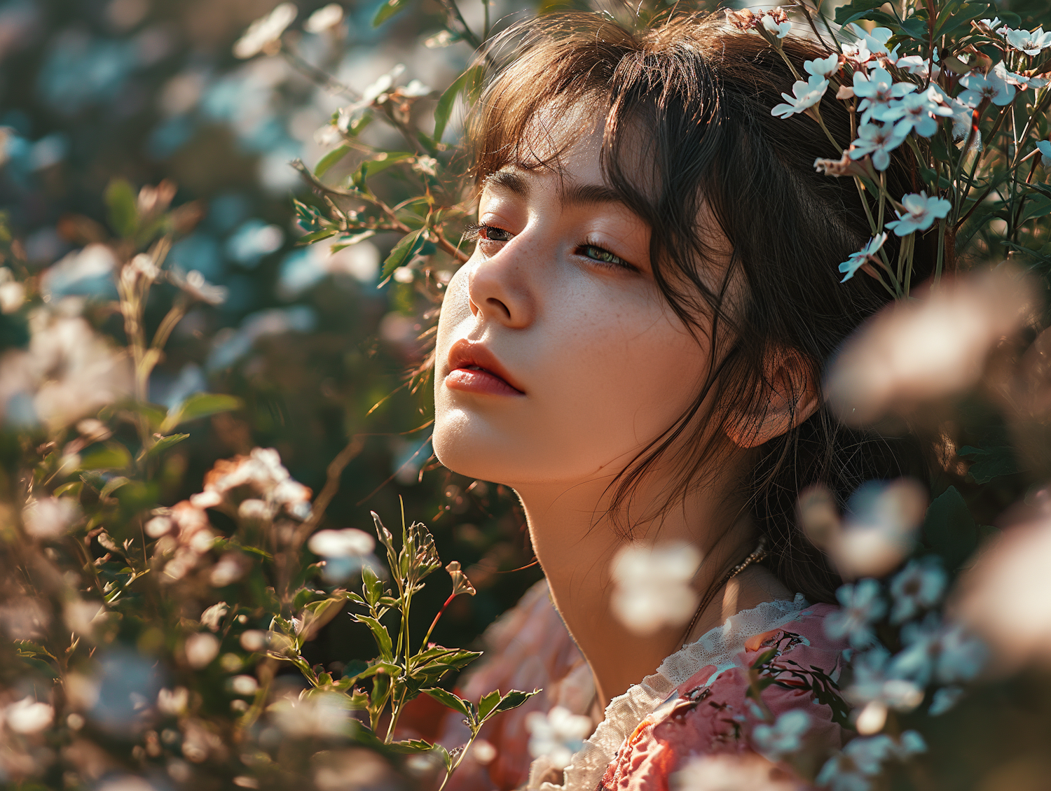 Serene portrait of a woman surrounded by blooming flowers, bathed in soft sunlight, creating a tranquil and ethereal atmosphere.