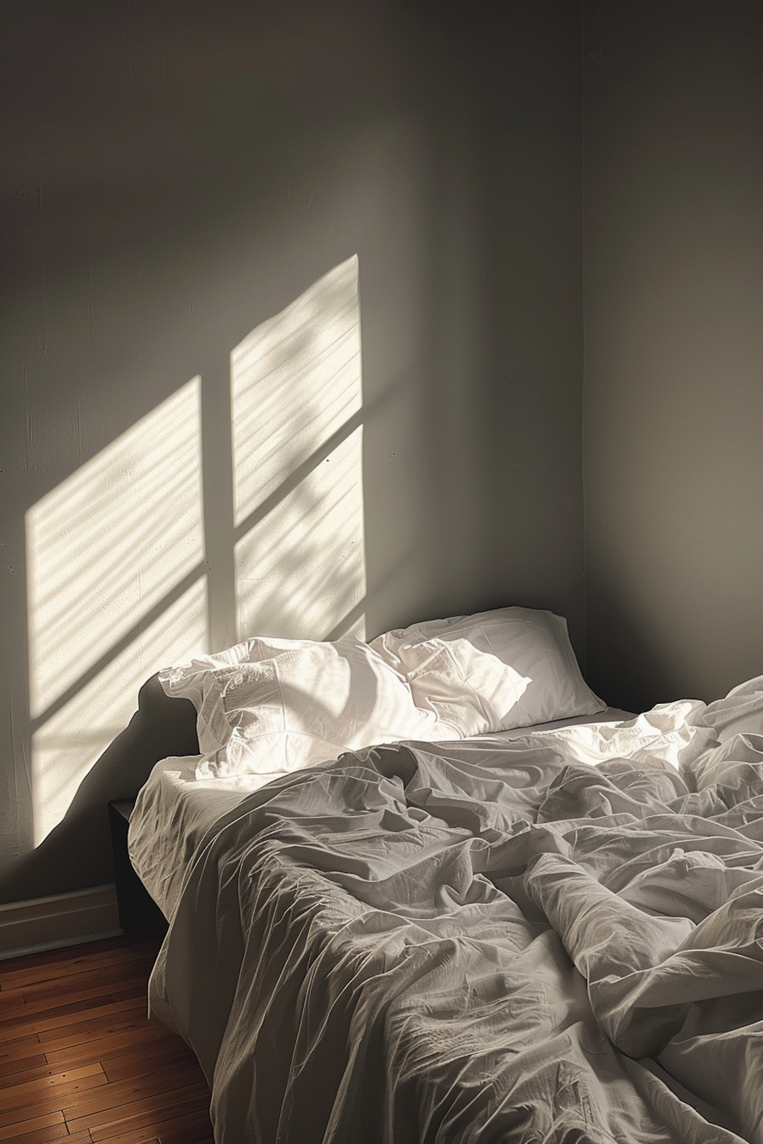 Sunlit bedroom with unmade white sheets and pillows, casting soft shadows on a light gray wall. Cozy and serene atmosphere.