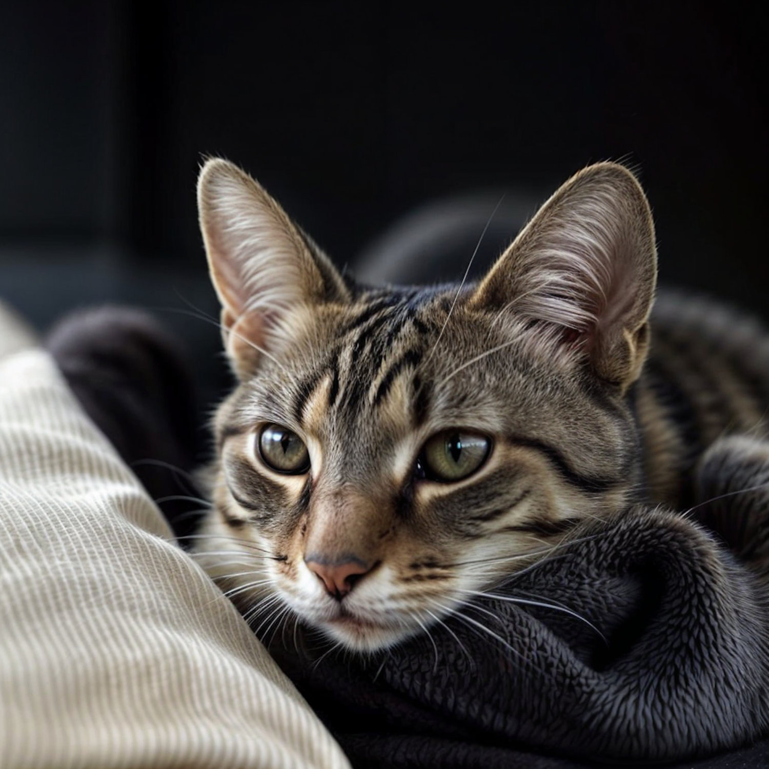 Close-up of a tabby cat with green eyes resting on a dark blanket, showcasing its striped fur and relaxed expression.
