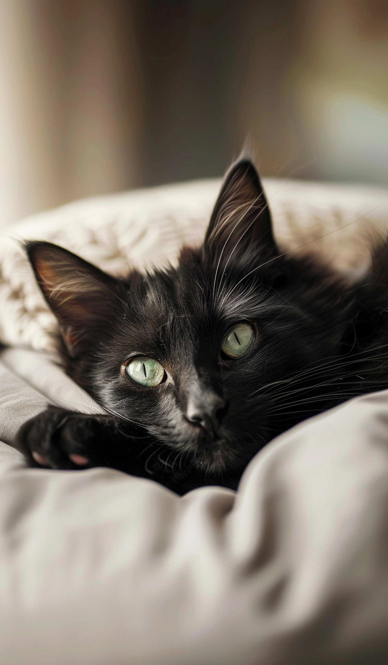 Black cat with green eyes resting on a soft blanket, creating a cozy and serene atmosphere.